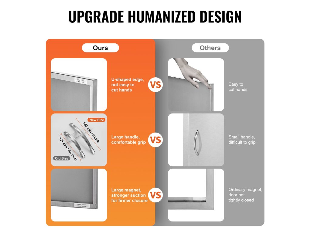 A kültéri konyhaajtó ergonomikus fogantyúval van ellátva a könnyű nyitás érdekében. Az ajtókeret élei hajlítottak és megerősítettek. Kivehető ajtókialakítás, amely lehetővé teszi a zsanér eltávolítását, így megváltoztatható az ajtó nyitási iránya. Az irányt a használati szokásoknak megfelelően állíthatja be.