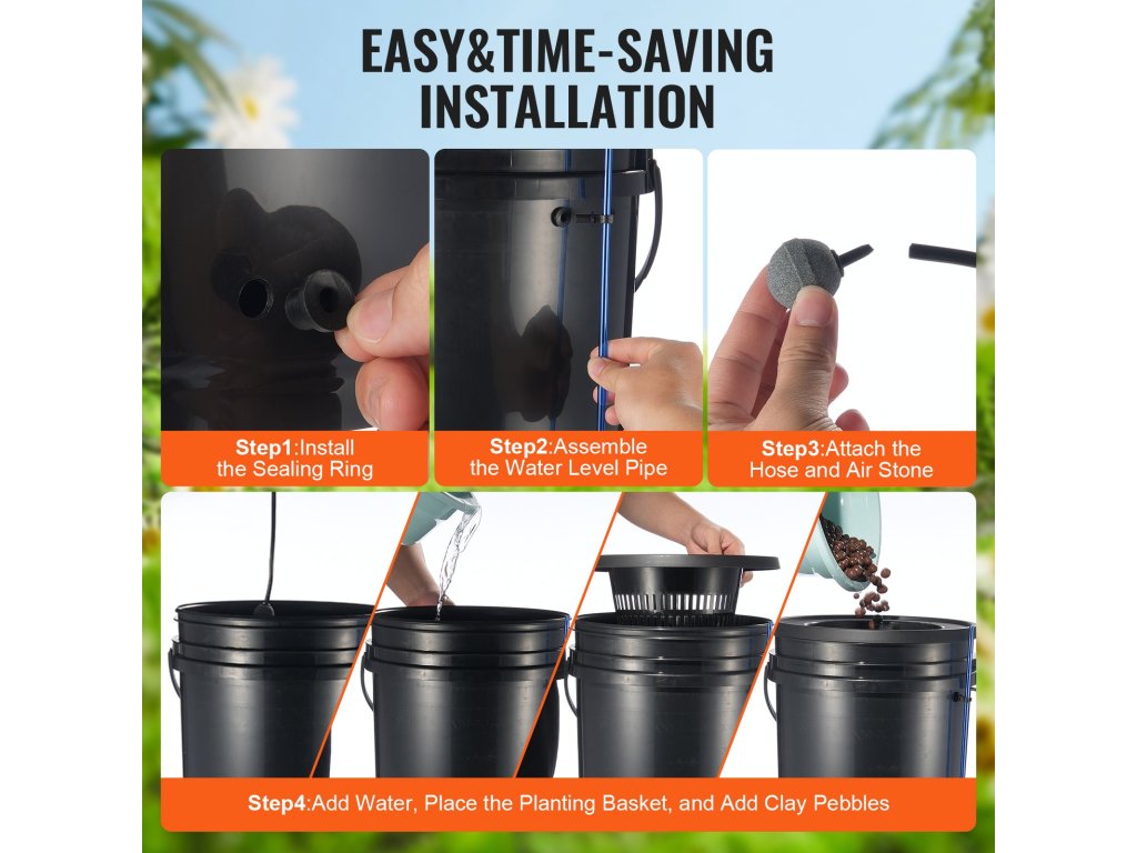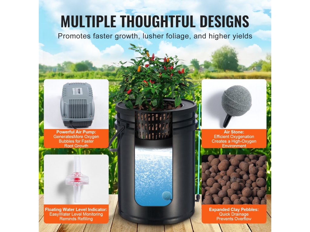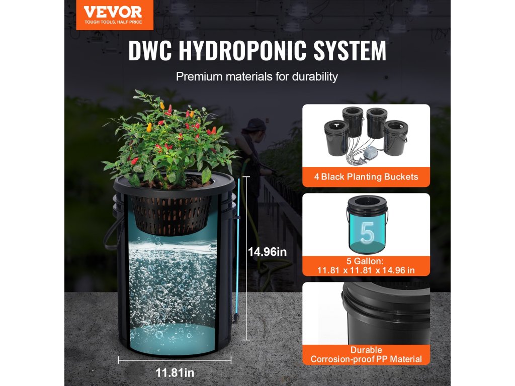 A DWC hidroponikus készlet négy 5 Gal vödörrel és 8" nyílású ültetőkosárral rendelkezik, amelyek lehetővé teszik a különböző zöldségek és gyümölcsök termesztését. A precíziós felső csepegtető öntözés jó tömítéssel, fokozza a könnyebb vízfelvételt.