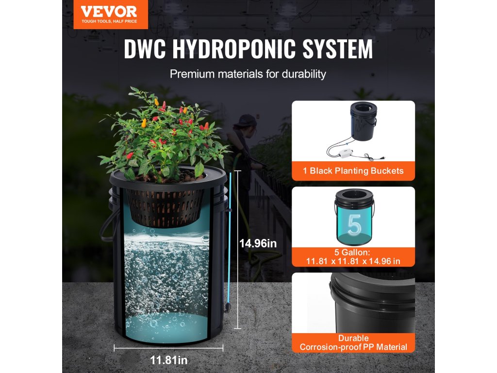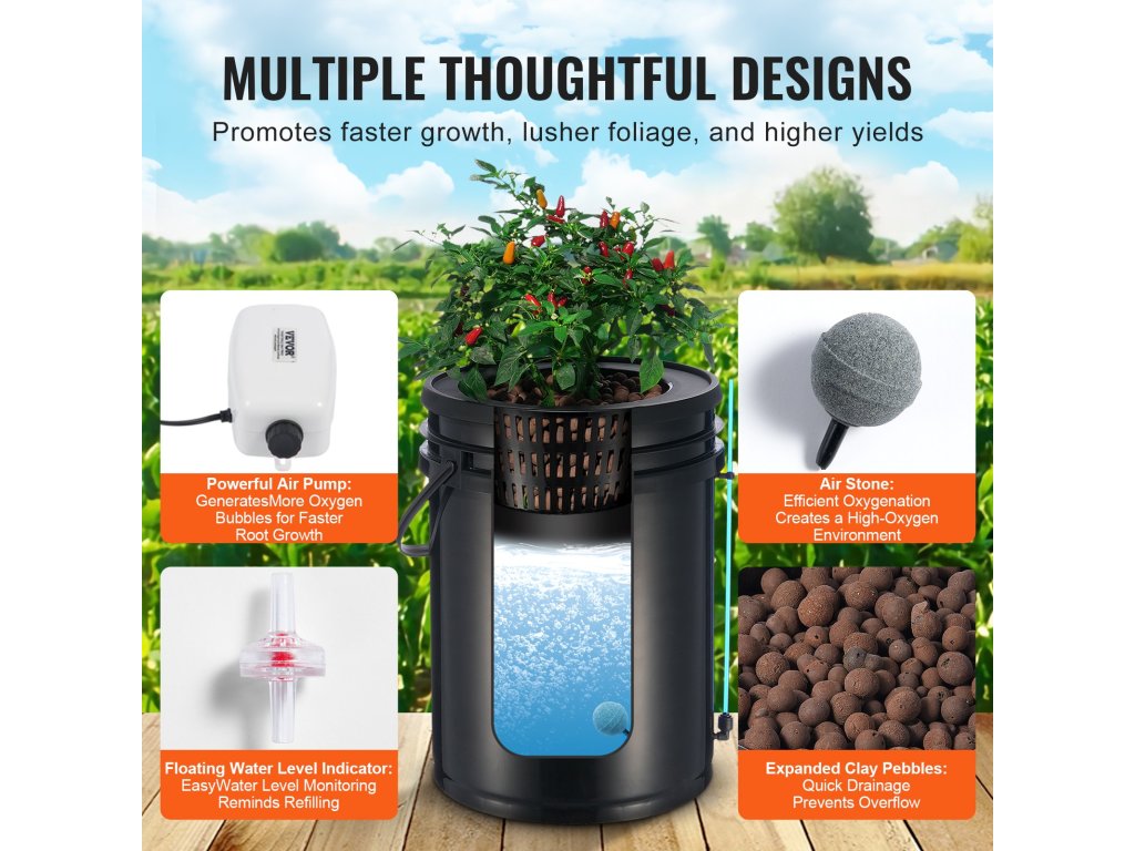 A DWC hidroponikus készlet egy 5 Gal vödörrel és egy 8" nyílású ültetőkosárral rendelkezik, amely lehetővé teszi a különböző zöldségek és gyümölcsök termesztését. A precíziós felső csepegtető öntözőrendszer jó tömítéssel, fokozza a könnyebb vízfelvételt.