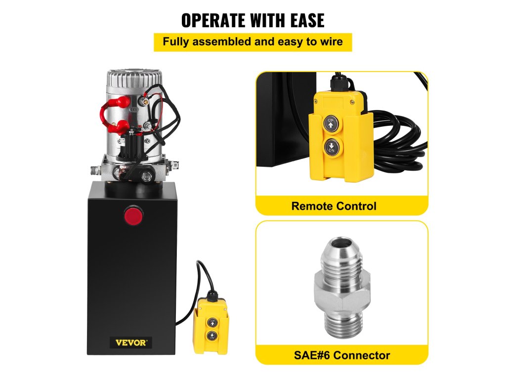 Hidraulikus elektromos szivattyúnk teljesen összeszerelt. Kézi távirányítóval és 1 további SAE#6 csatlakozóval szállítjuk a cseréhez. A teljes meghajtóegység könnyen csatlakoztatható és könnyen kezelhető.