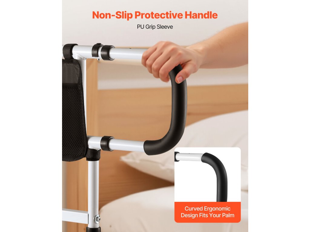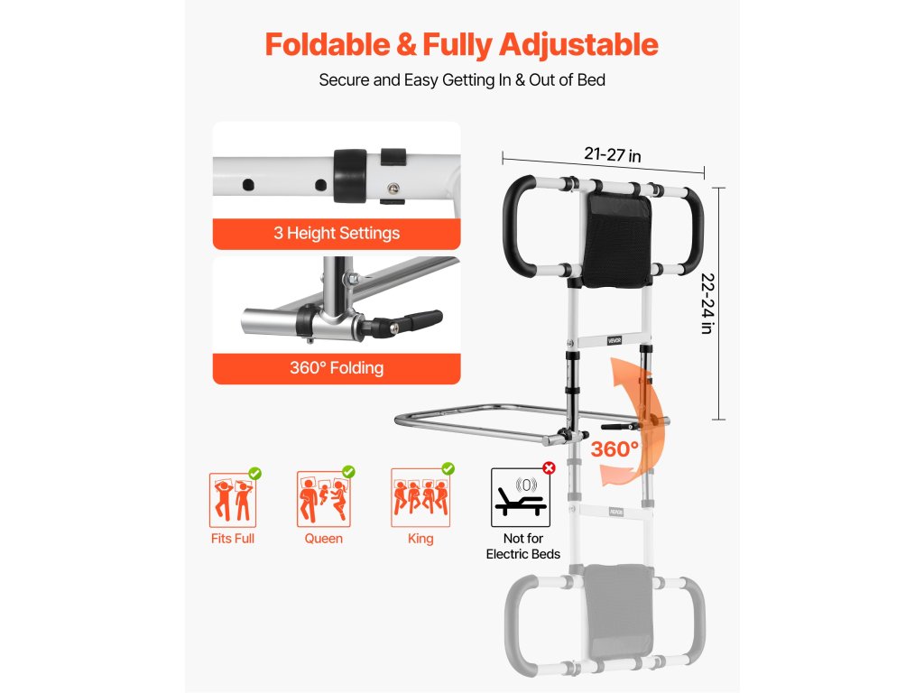 Amikor nincs használatban, ez az ágykorlát 360°-ban összecsukható, így könnyebb az ágyba be- és kiszállni, helyet takarít meg, és biztonságos használat esetén csökkenti az ütközések vagy botlások kockázatát.