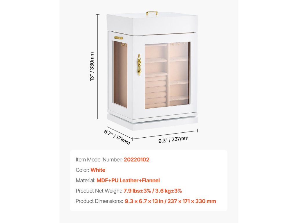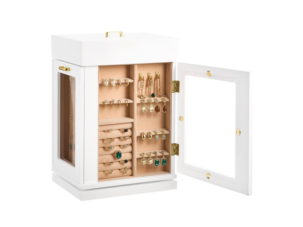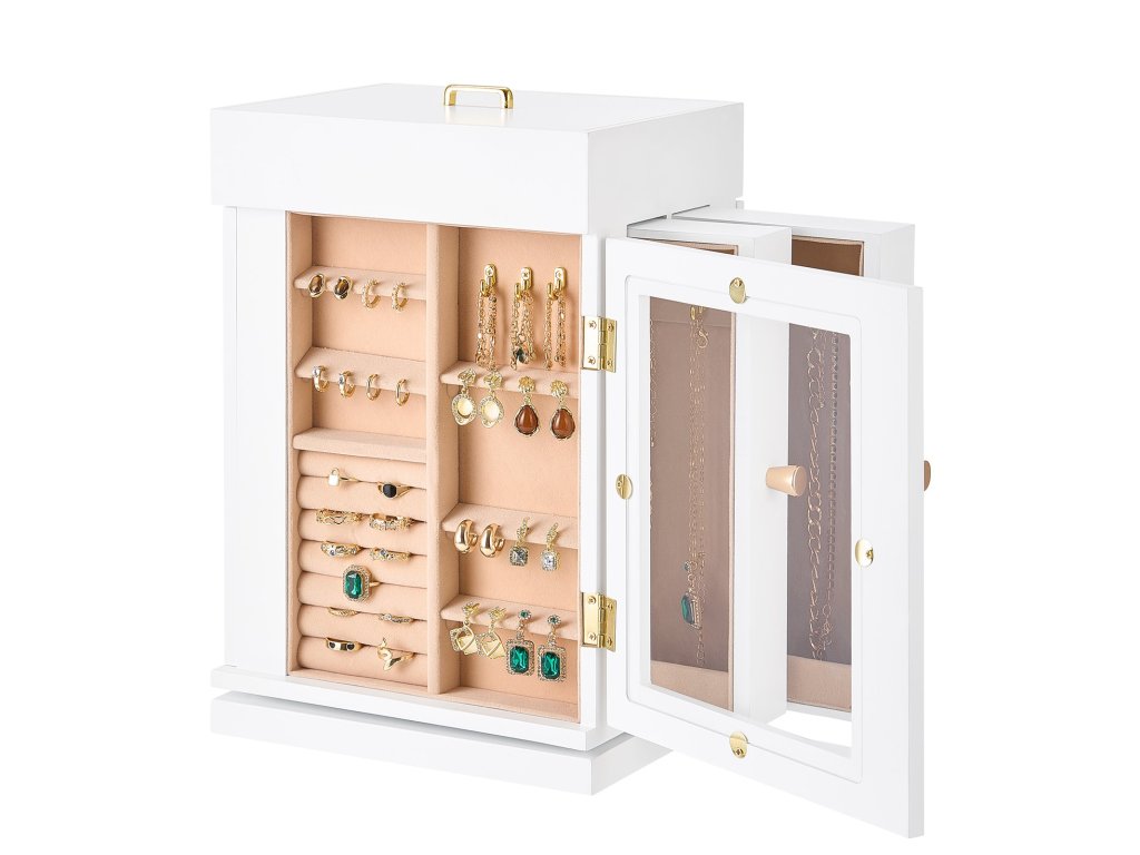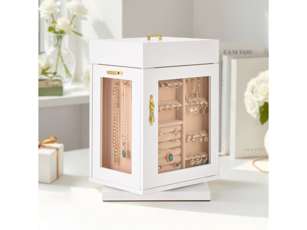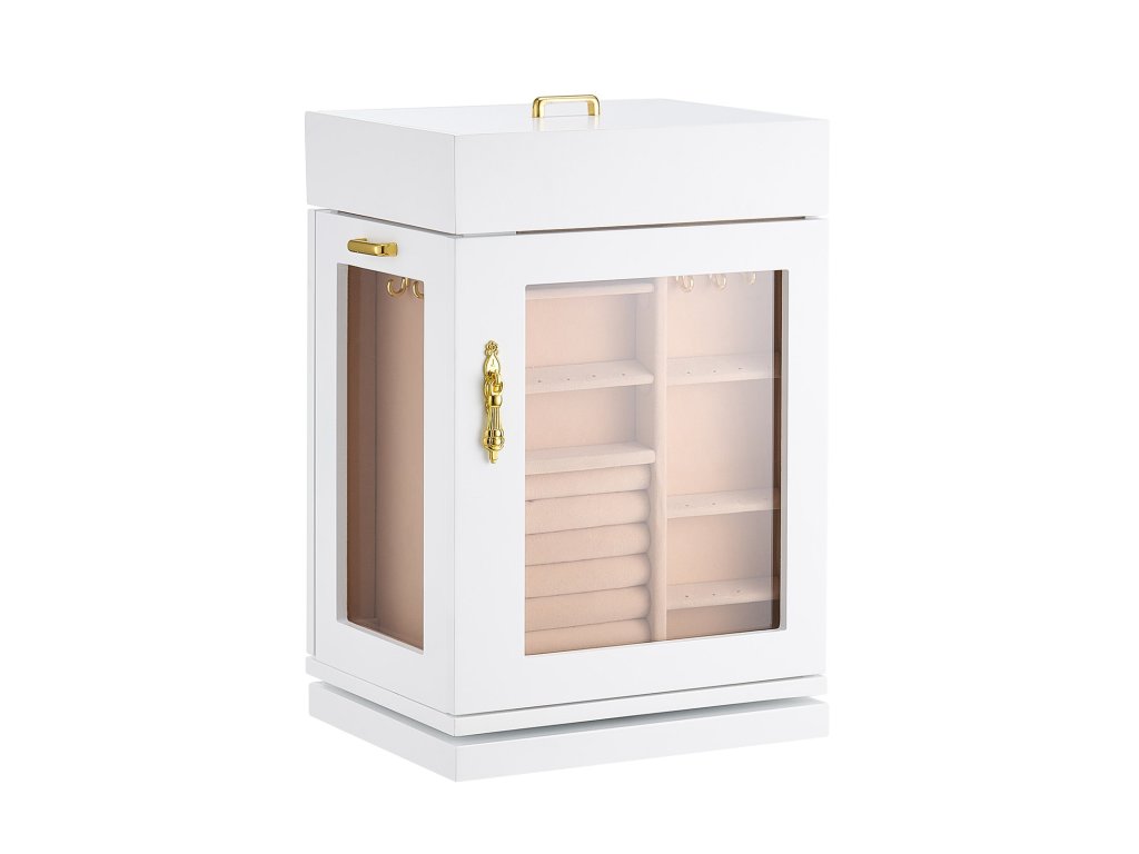 Ékszerdoboz 360°-ban forgatható, mágneses ajtóval, 4 akasztóval, fehér