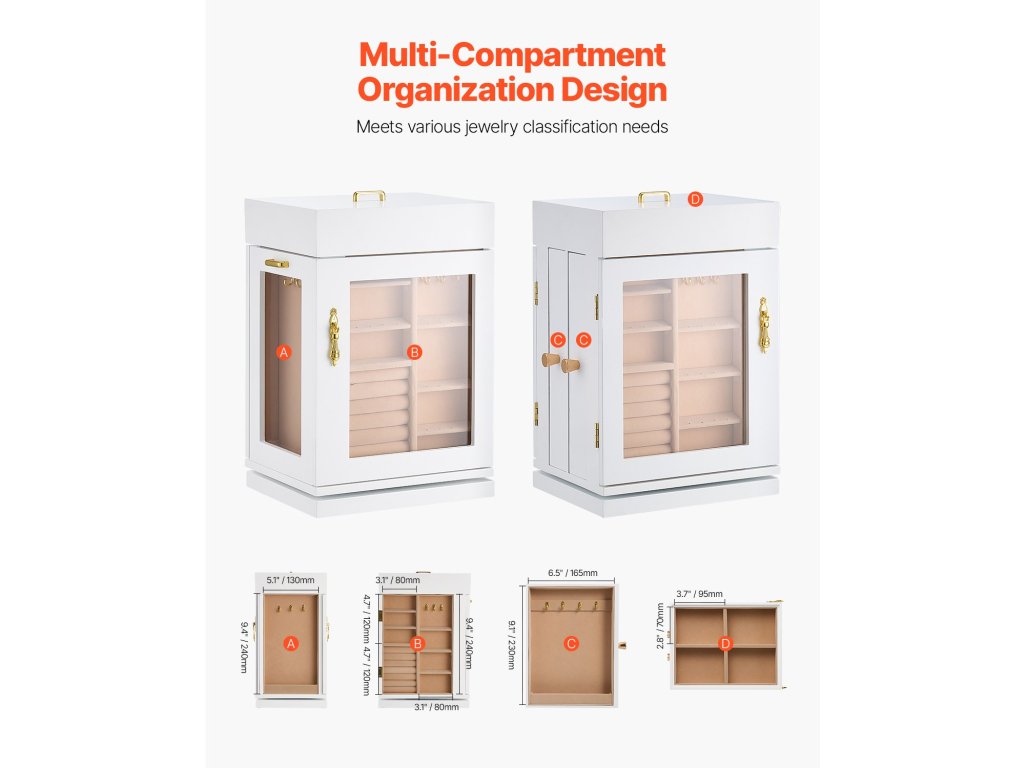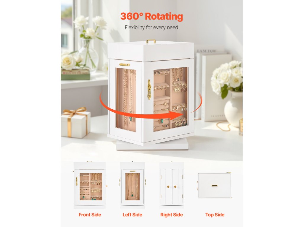 Ez az ékszerrendező 360°-ban forgatható, hogy teljes 360°-os kilátást biztosítson a könnyű megtekintés és a gyors hozzáférés érdekében, így gond nélkül megtalálhatja és rendszerezheti ékszereit.