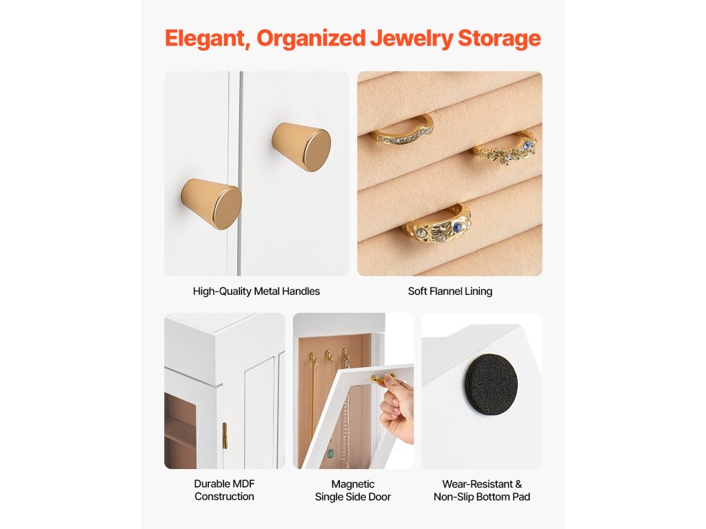 A prémium fém fogantyúkkal, a masszív MDF-konstrukcióval, a puha flanel béléssel és az alján lévő csúszásmentes, tartós betéttel ez az ékszerdoboz kivételes kézműves munkát és tartós tartósságot biztosít.