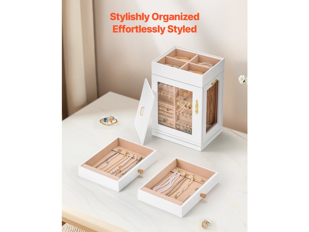 A könnyen nyitható függőleges fiókok 4 kampóval és 7,9 hüvelyk/200 mm magassággal kombinálva rendezetten, csomók nélkül tartják hosszú nyakláncait, így a tárolás és a hozzáférés kényelmes.