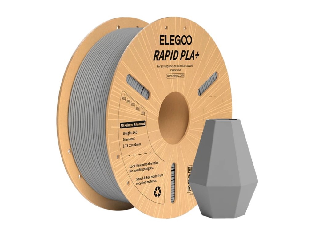 A szürke színű Rapid PLA+ (polilaktid plusz - növényi eredetű, biológiailag lebomló, a tartósságot növelő adalékanyagokkal dúsított anyag) ELEGOO szürke színű filament gyors technikai nyomatokhoz készült. A visszafogott szín elrejti a kisebb hibákat, és lehetővé teszi, hogy a modell formájára összpontosítson. Az anyag jól használható használati projektekhez, prototípusokhoz és tervezési elemekhez, ahol fontos a pontosság és a megismételhetőség. A tekercsbe 1 kg műanyag fér.