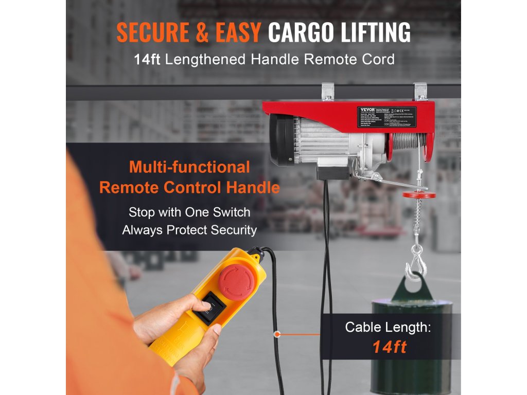 VEVOR, az Ön exkluzív szerszámszakértője. Ez az elektromos emelő tiszta réz motorral van felszerelve, amely nagy teherbírást biztosít a nehéz tárgyak emeléséhez. A 14 láb hosszú, meghosszabbított drótkötél lehetővé teszi, hogy az emelőt biztonságos helyen működtesse.