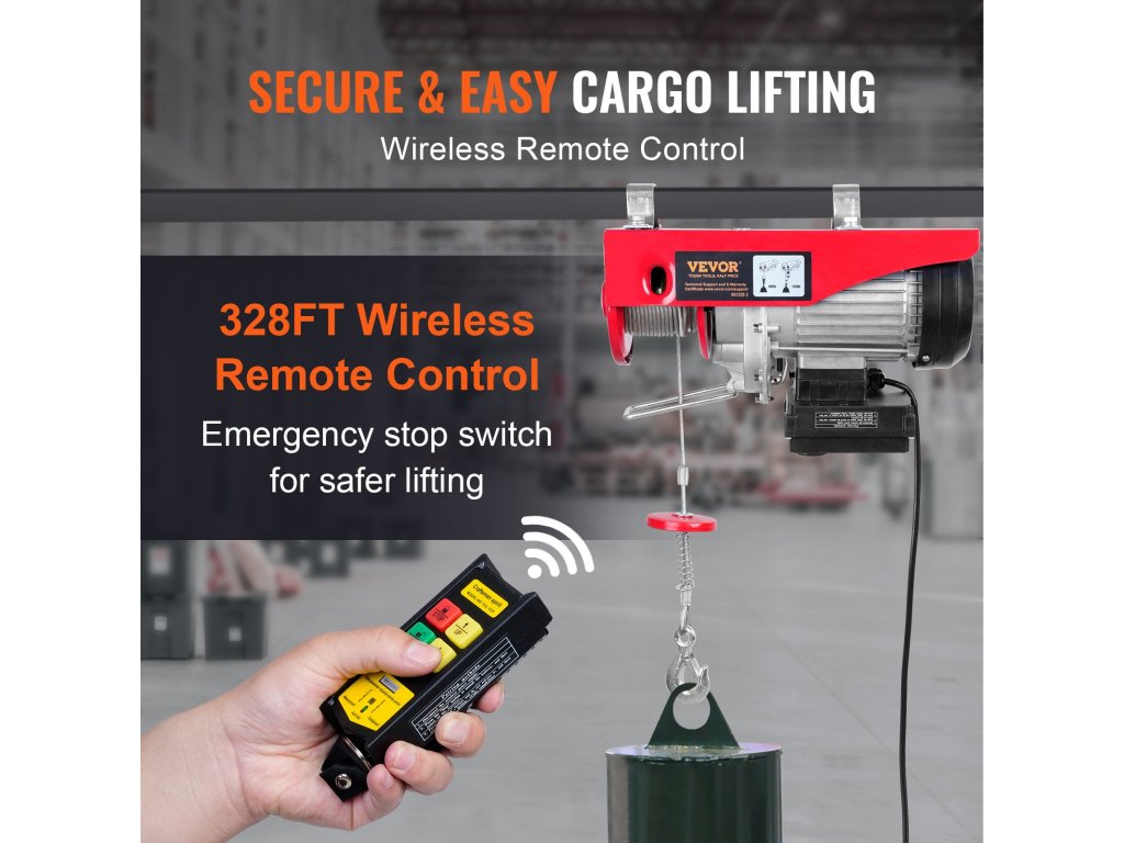 VEVOR, az Ön exkluzív szerszámszakértője. Ez az elektromos drótkötél-emelő nagy teljesítményű motort használ, amely nagy emelőkapacitást biztosít a nehéz tárgyak felemeléséhez. A vezeték nélküli távirányító lehetővé teszi, hogy az emelőt biztonságos helyen működtesse.