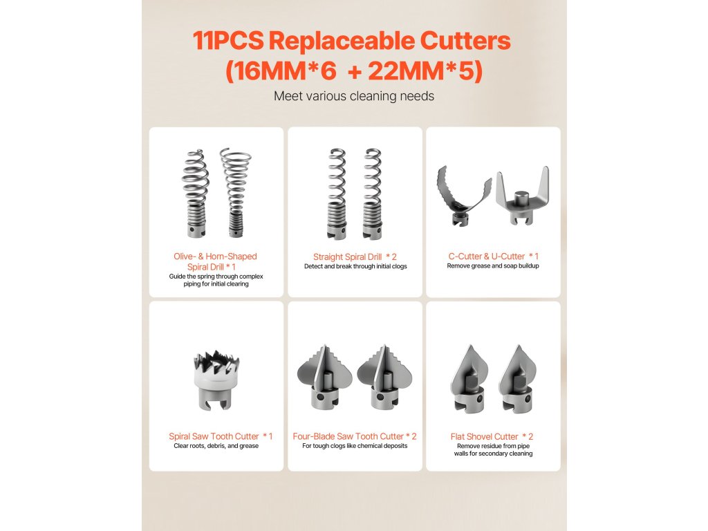 Ez a hulladéktisztító 11 cserélhető vágóval (16mm*6, 22mm*5) van felszerelve, és könnyen alkalmazkodik a különböző dugulási körülményekhez, mint például zsír, haj, papír és szennyeződés. Az előre/vissza vezérléssel a kábeles működés zökkenőmentes és könnyed.