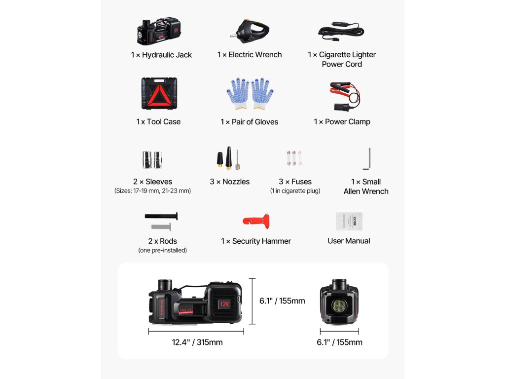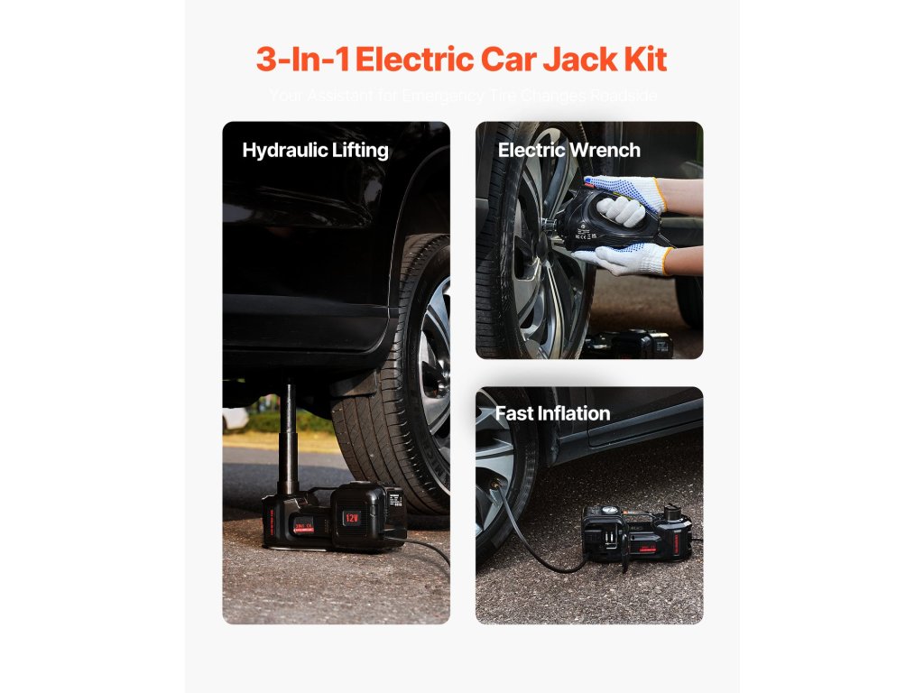 Ha autója defektet kap az úton, elektromos kerékcsere-készletünk páratlan segítséget nyújt. A felfújhatóval felszerelt emelő kiváló minőségű hidraulikus szerkezetet és nagy teljesítményű motort használ, amely 2 perc alatt megemeli a járművet, és másodpercek alatt eltávolítja a kerékcsavarokat.