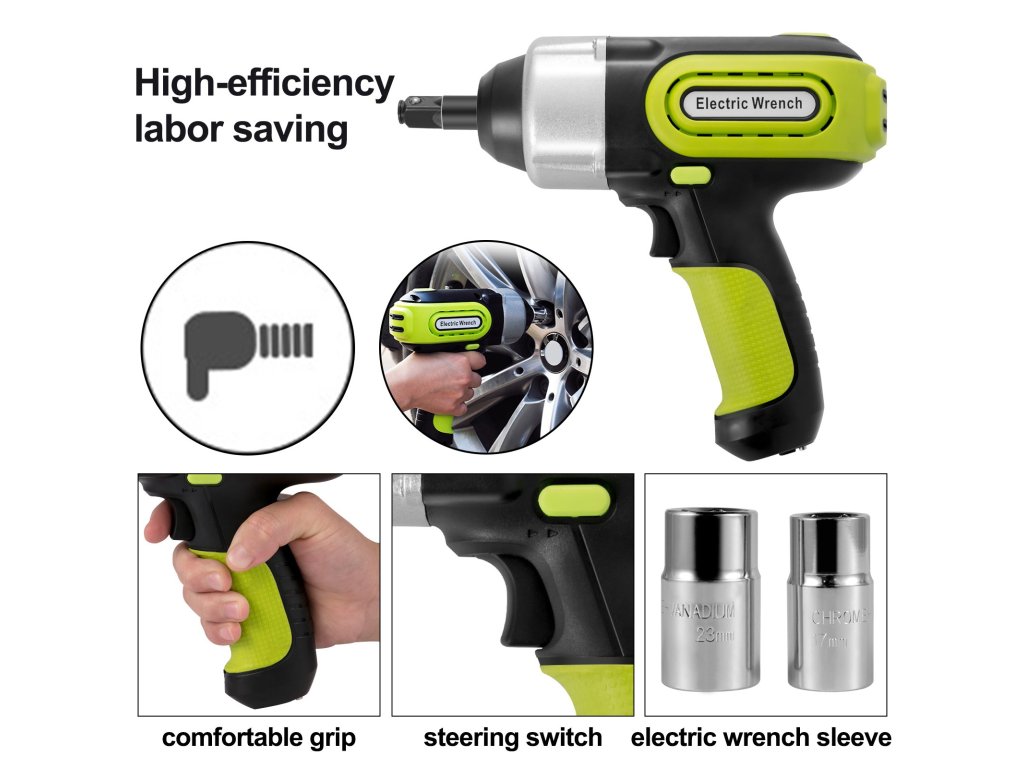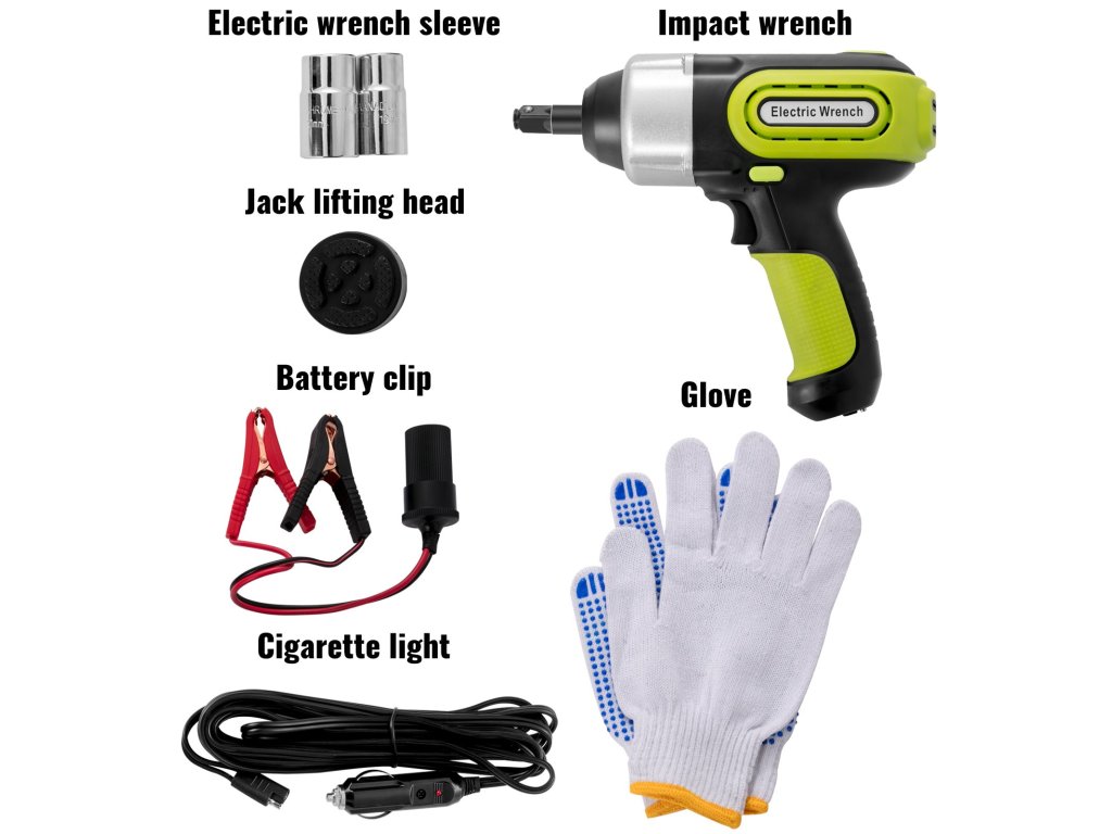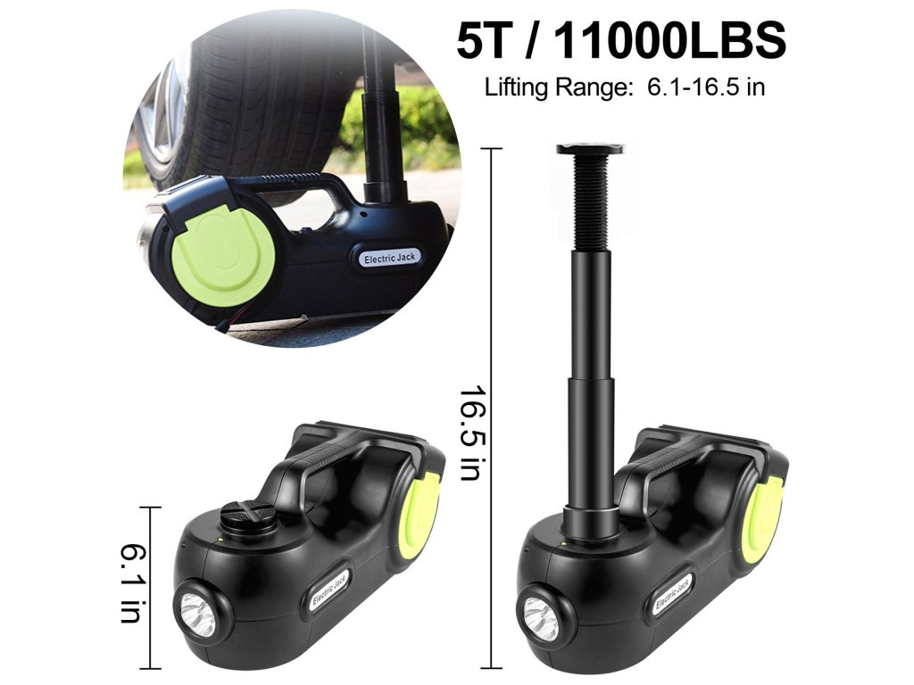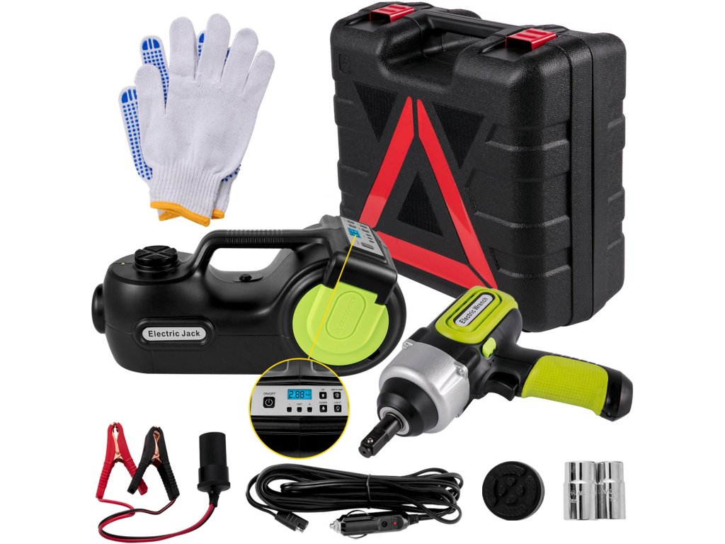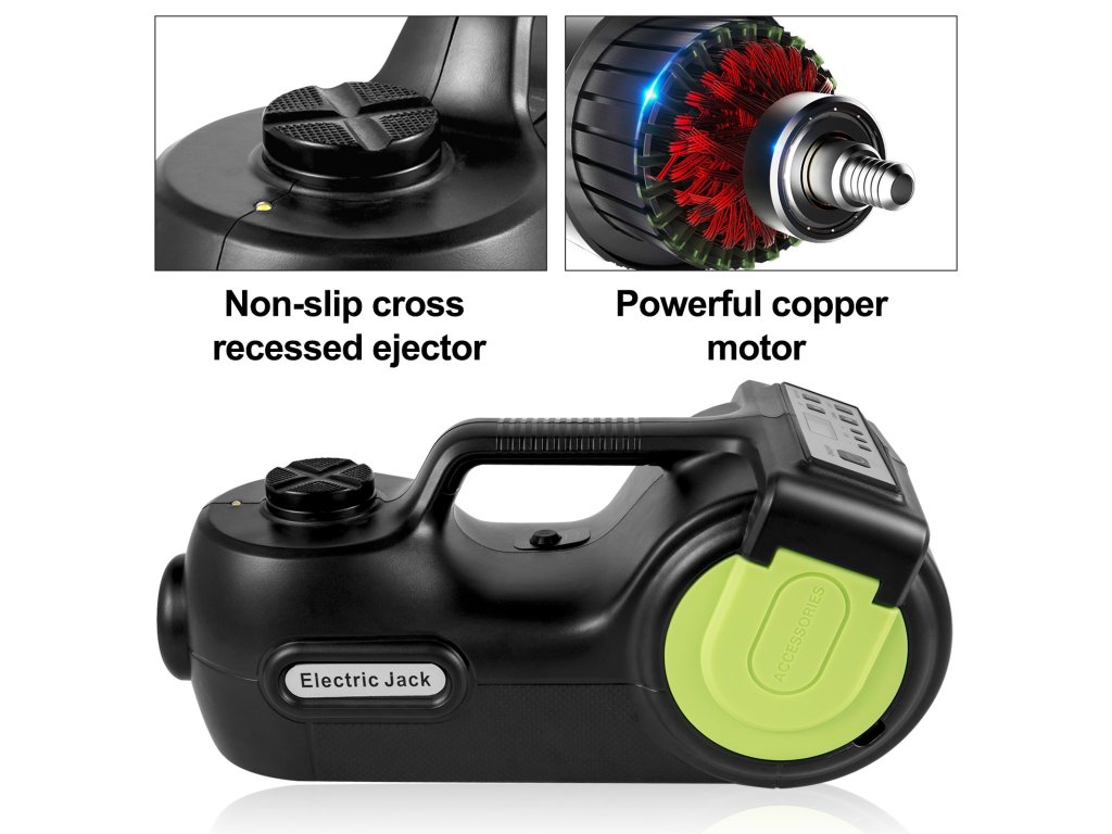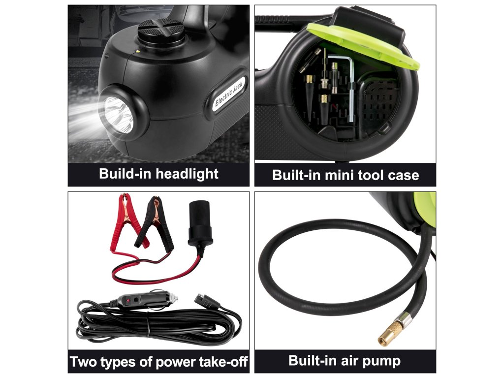 Az elektromos emelő négy funkcióval rendelkezik, hidraulikus emelő, gumiabroncs-felfújó pumpa, figyelmeztető lámpa és LED-es lámpa, amely többféle igényt is kielégít. Az elektromos villáskulccsal gyorsan eltávolíthatja a csavarokat és kicserélheti a gumiabroncsokat. A darukészlet nélkülözhetetlen segítő garázsok, gazdaságok, autópályák és hosszú utak nélkülözhetetlen segítője. Nagyon praktikus a vészhelyzeti kerékcserékhez az úton.