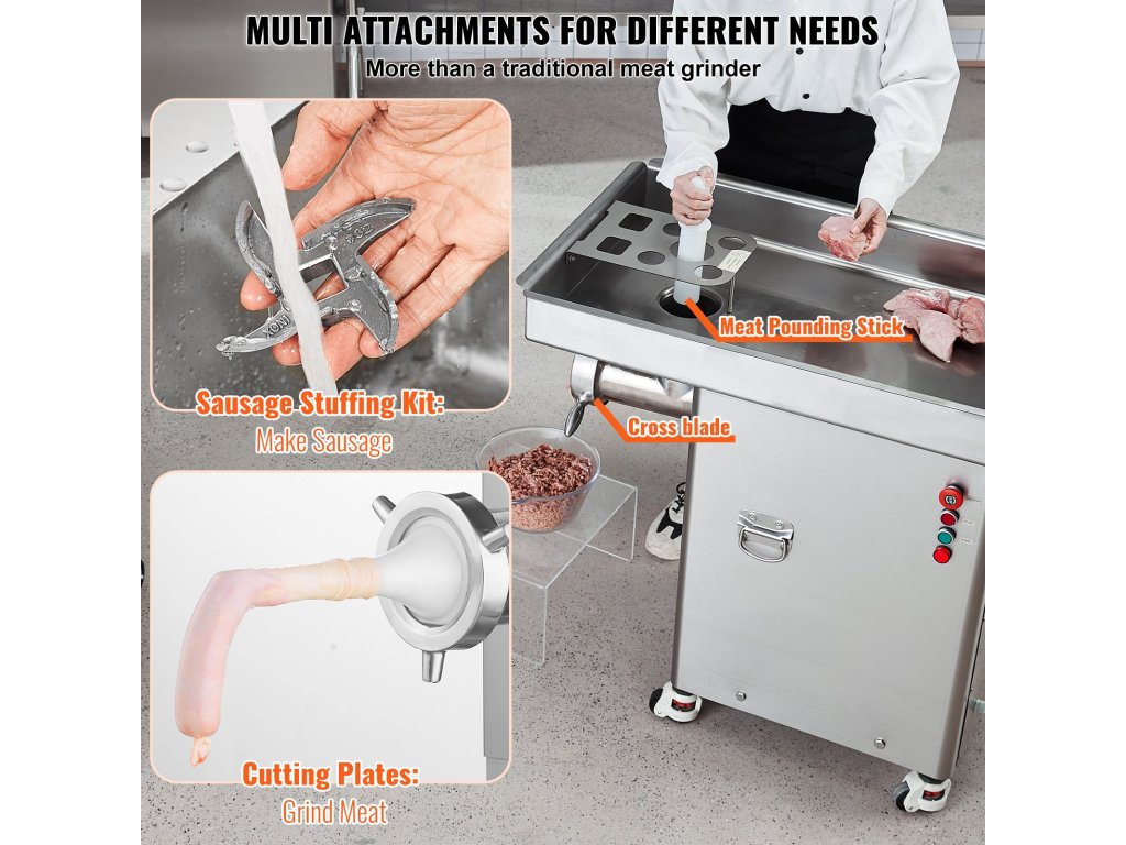 A húsdaráló 4 mozgatható kerékkel van felszerelve, amelyek közül 2 fékkel van ellátva, így a készüléket könnyedén mozgathatja bármilyen helyre. Különösen alkalmas hentesüzletekben, szupermarketekben, gyorséttermekben, szállodákban és élelmiszeripari létesítményekben való használatra.