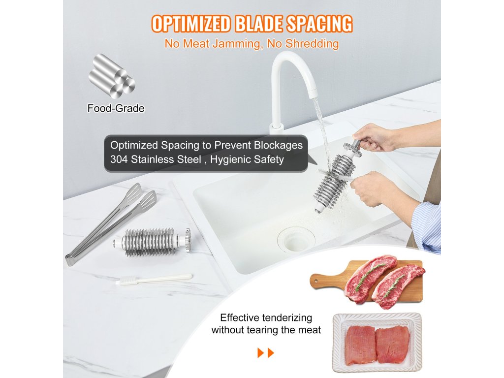 Elektromos húspogácsaink 54 precíziós rozsdamentes acélból készült pengével vannak felszerelve, amelyek kereskedelmi puhító hatást biztosítanak, így a hús ízletesebbé és élvezetesebbé válik. A pengék gerincének optimalizált elhelyezése megakadályozza a hús eltömődését, így biztosítva a zökkenőmentes puhítási folyamatot.