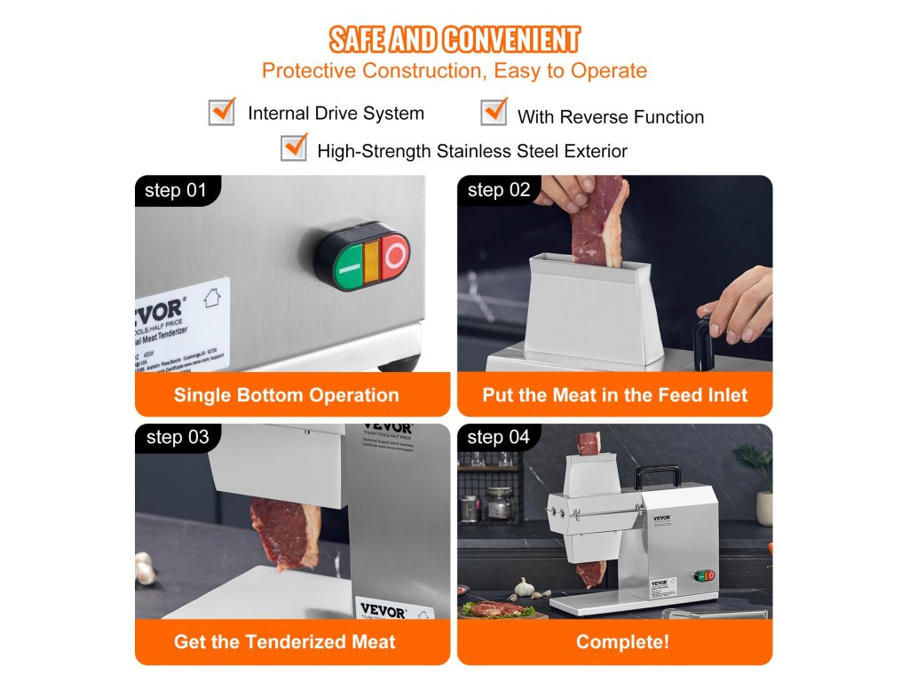 Elektromos húspuhító készülékünket egyszerű és könnyű használatra terveztük, négylépcsős puhítási eljárással. Belső hajtóműve és külső rozsdamentes acélszerkezete, beleértve a hátrameneti funkciót is, biztonságos működést biztosít.