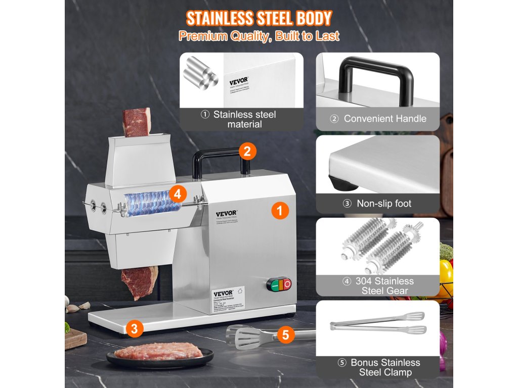 Az elektromos húsklopfoló kiváló minőségű rozsdamentes acélból készült, amely erős, tartós és rendkívül korrózióálló. Ellenáll a gyakori mosásnak és a hosszan tartó használatnak, így biztosítja a termék hosszú élettartamát és kivételes értéket nyújt.
