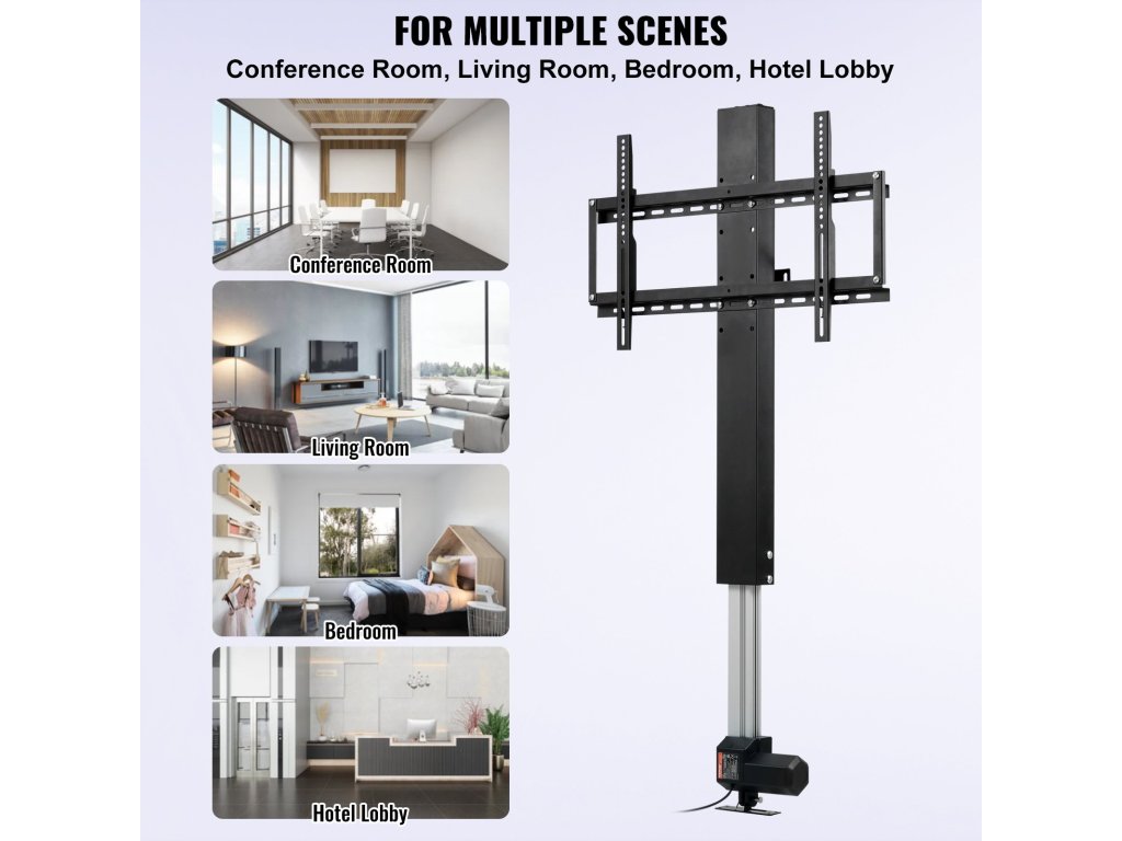 Ez a motoros TV-emelő konzol a stabilitás érdekében falra vagy a padlóra szerelhető. Alkalmas mind háztartási, mind kereskedelmi alkalmakra, például hálószobába, konferenciaterembe.