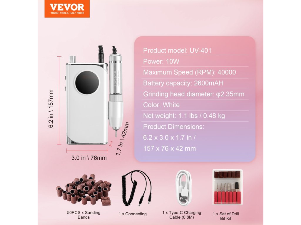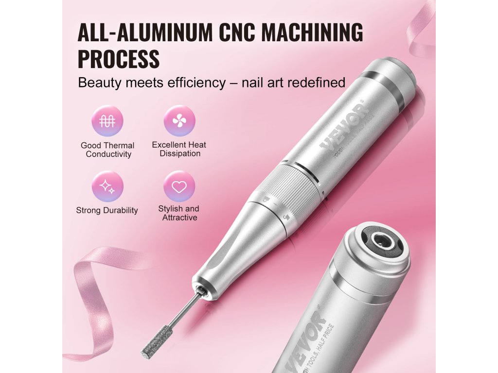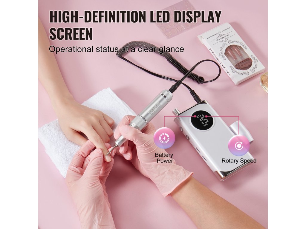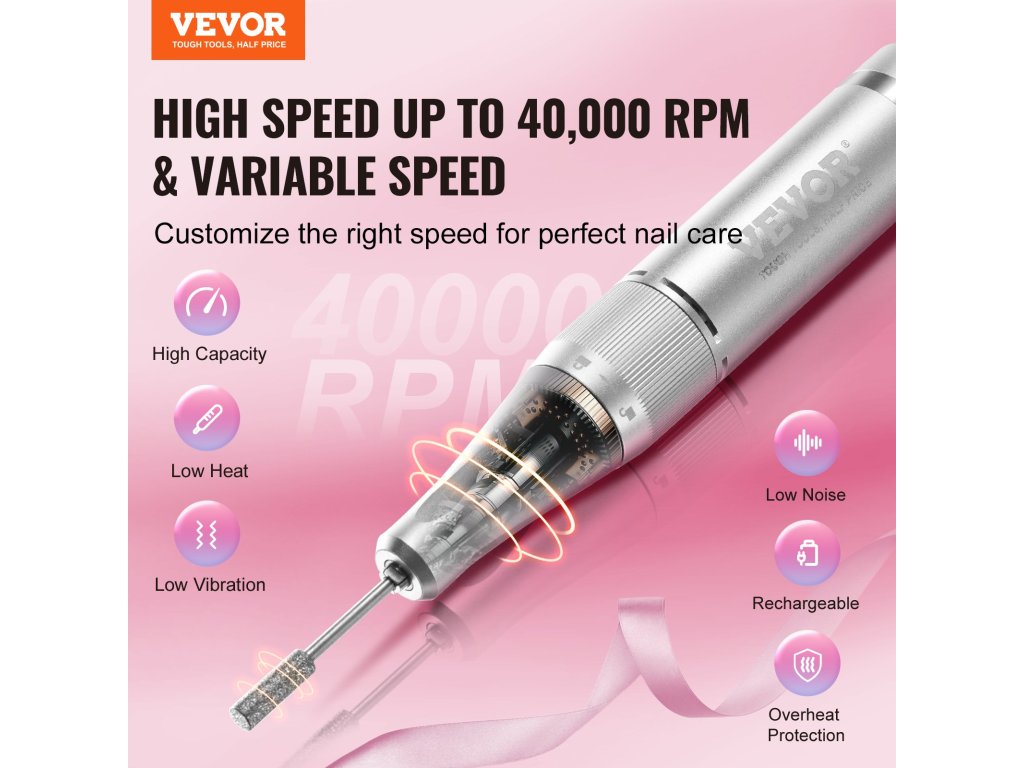 A VEVOR vezeték nélküli elektromos körömreszelő 6 csiszolófejjel és 50 csiszolócsíkkal rendelkezik, így mindent biztosít, amire szüksége van az elhalt bőr, a géllakk eltávolításához és a körömfelület tökéletesre finomításához - ideális kezdőknek és profiknak egyaránt.