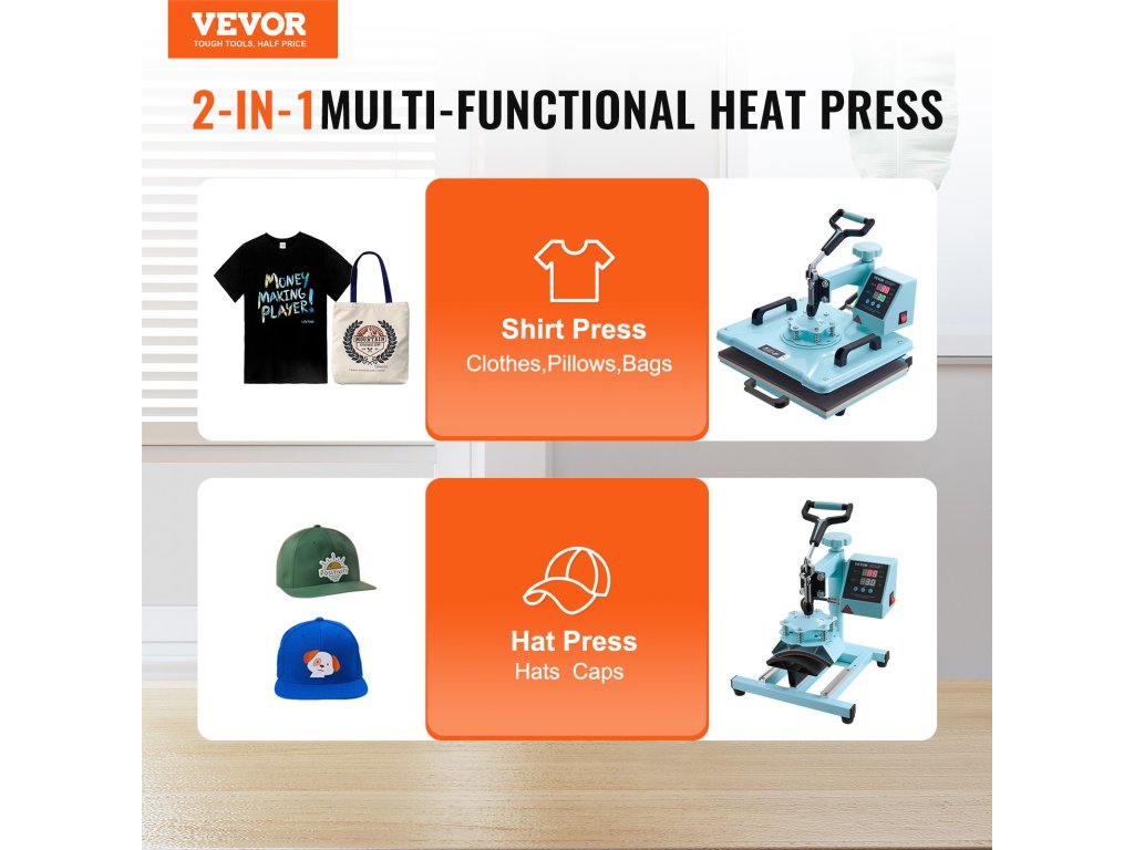 Hőprésünk többféle tartozékkal van felszerelve, amelyekkel könnyedén átviheti a gyönyörű mintákat pólókra, párnahuzatokra és sapkákra, és korlátlan kreativitást szabadíthat fel. Legyen szó személyre szabott ajándékok vagy egyedi barkácsprojektek készítéséről, ez a készülék megoldást kínál Önnek.