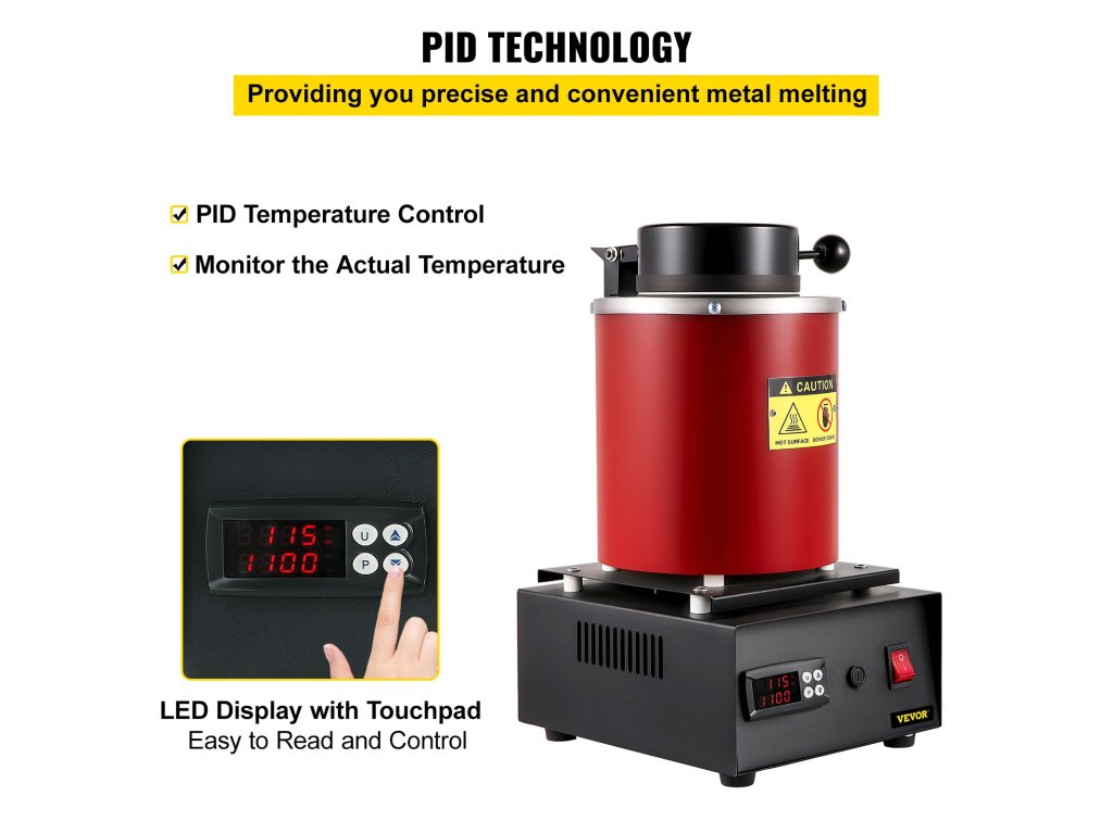 A fémolvasztó kemence magas hőmérsékletű ötvözött fűtőszálat használ a gyors és hatékony fűtéshez, amely eléri a 2102℉ / 1150 ℃-ot. A 2012 ℉ / 1100 ℃-nál alacsonyabb olvadáspontú fémeket körülbelül 45 perc alatt megolvasztja, beleértve az aranyat, a tiszta ezüstöt, a tiszta rezet és az alumíniumot.