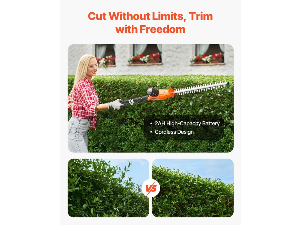 Tapasztalja meg a vezeték nélküli vágás szabadságát! Az 5 állítható szögű és teleszkópos kialakítású, nagy teljesítményű sövénynyíró segítségével könnyedén megbirkózhat a magas ágakkal, és kertjét rendben és szépen tarthatja.