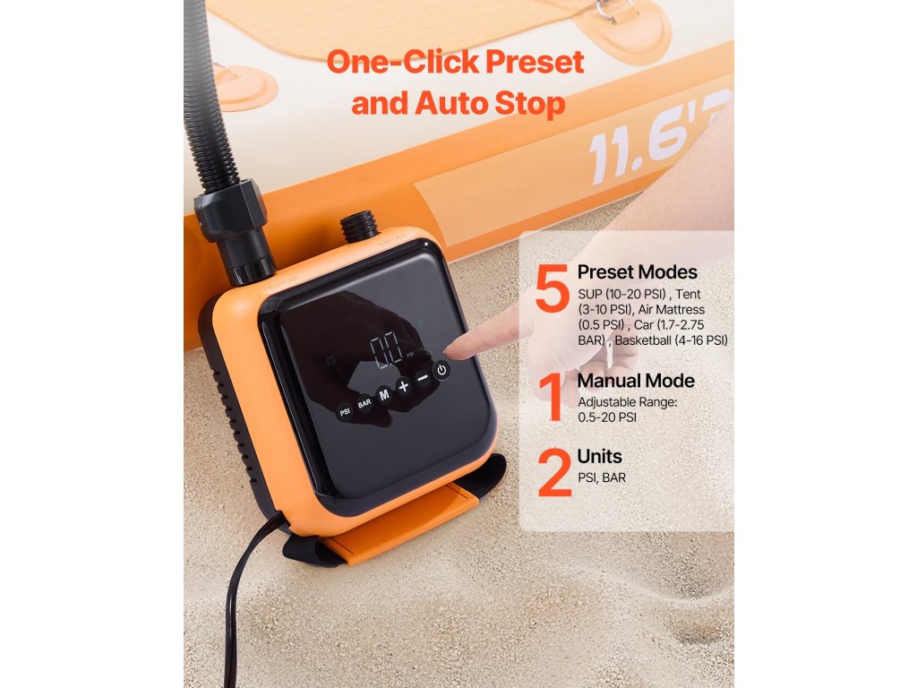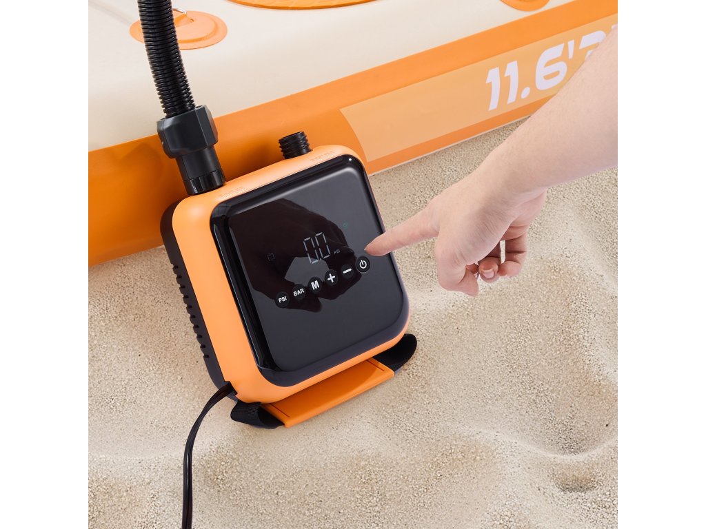Ez az elektromos szivattyú otthoni és autóipari használatra készült, és 40 PSI nyomást biztosít 6 üzemmóddal (5 előre beállított + 1 egyéni). A SUP-ot 9 perc alatt 12 PSI-re fújja fel, gumiabroncsokon is működik, és a könnyű tárolás érdekében leeresztő funkcióval is rendelkezik. Könnyű és tökéletes kempingezéshez és utazáshoz.