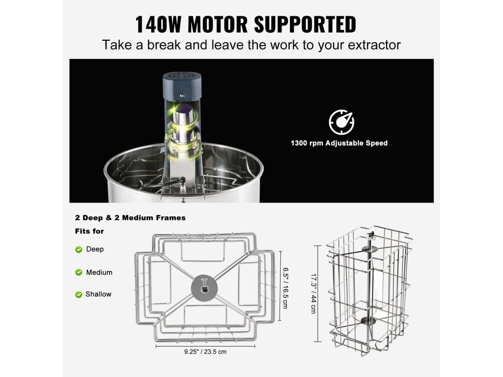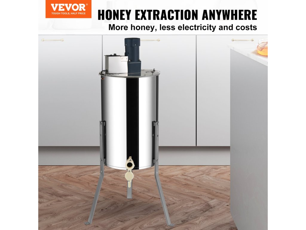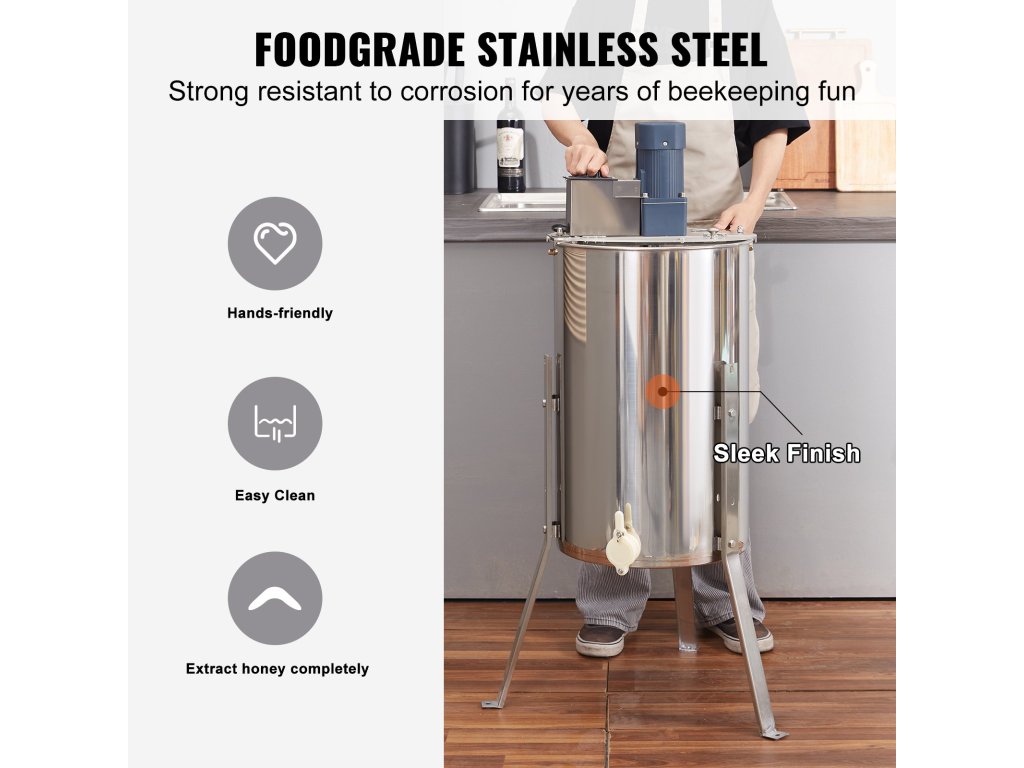 Az acél mézelvonó 1,8 hüvelykes/45 mm-es mézszeleppel van felszerelve a méz kiürítéséhez, és kúpos aljával segíti a méz teljes eltávolítását.