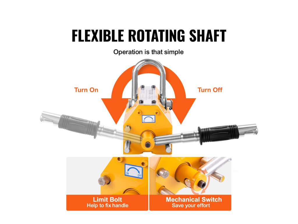 Emelőmágnesünk megerősíti a biztonsági kapcsolóval tervezett ütközésgátló fogantyút, míg a végcsavar szilárdan rögzíti a fogantyút emelés közben.