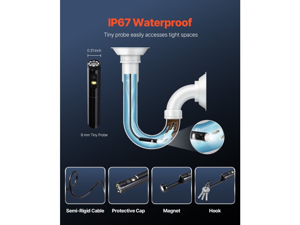 A vízvezeték-ellenőrző kamera 8+1 LED-es lámpával rendelkezik, amelyek állítható fényerővel rendelkeznek, így sötét helyzetekben is elegendő fényt biztosítanak. 0.a 8 - 2,8 hüvelyk (2 - 7 cm) optimális gyújtótávolság nagy látómezőt biztosít a tiszta vizsgálathoz, ami kiválóan alkalmas a motor belső hengerének és a vízvezetékeknek az ellenőrzésére.