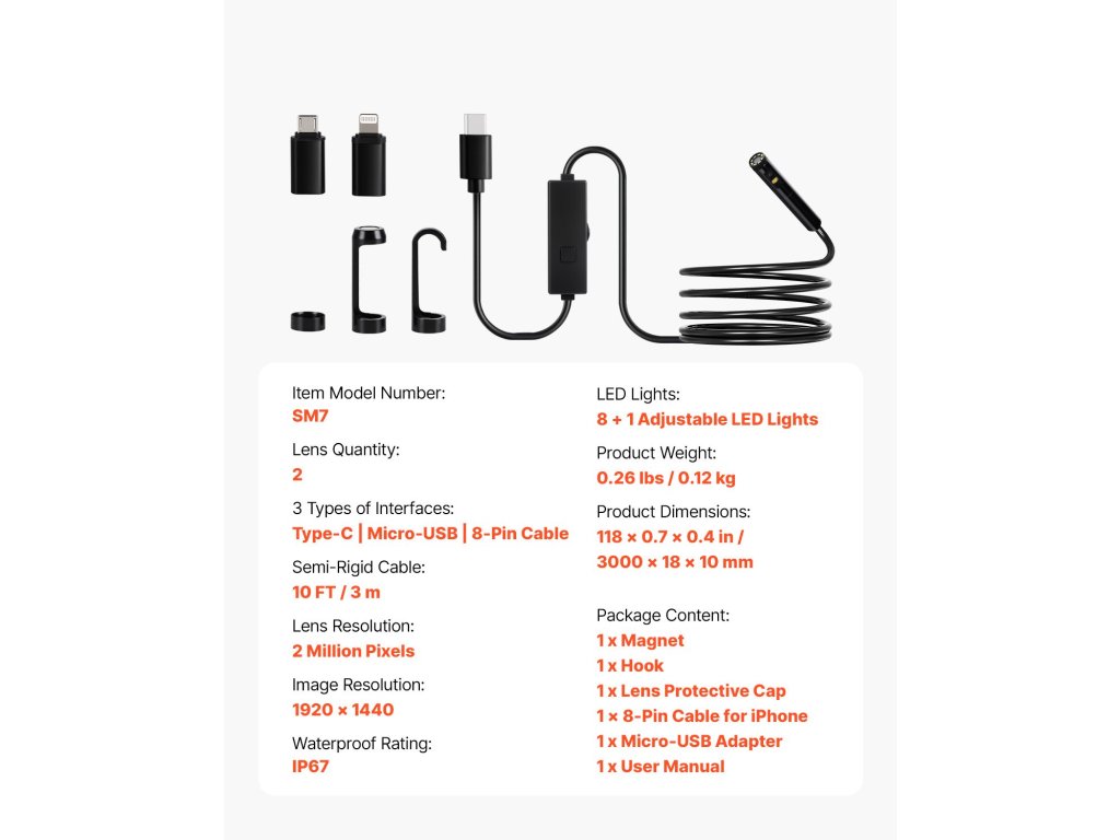 Endoszkópunkat két lencsével fejlesztettük, hogy különböző nézeteket kaphasson. 8 tűs kábellel, Type-C adapterrel és Micro-USB adapterrel érkezik, kompatibilis az iOS 9+ és Android 6+ rendszerekkel OTG támogatással, ideális autóipari motorvizsgálatokhoz, csatornavezetékek vizsgálatához, HVAC-csatornák vizsgálatához és sok máshoz.