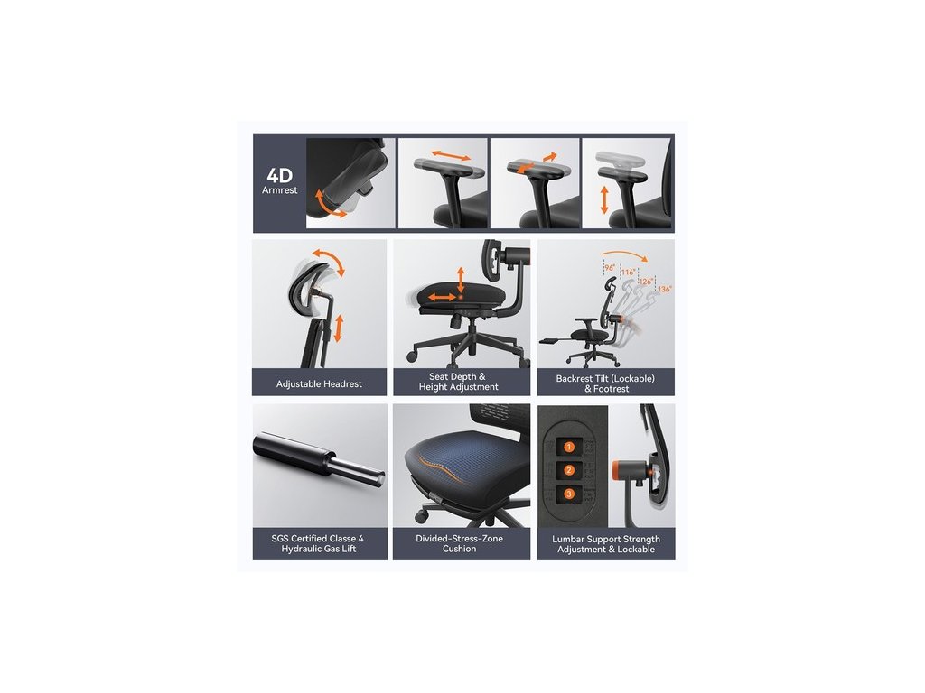 Visszahajtható lábtartóval rendelkezik, és 4 kulcspozícióban, 96°-136°-os dőlésszögben rögzíthető, így mindig kényelmes marad.