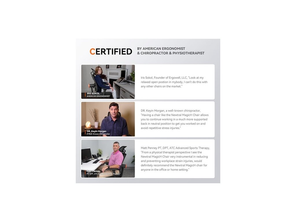 Ezt a széket olyan szakértők támogatták, mint Iris Sokol, amerikai ergonómus; Dr. Kevin Morgan, egy neves csontkovács; és Matt Penney PT, DPT, ATC az Advanced Sports Therapy-tól. Elősegíti a nyugodt, semleges hátpozíciót, hatékonyan enyhíti és megelőzi a helytelen testtartás okozta sérüléseket, ami megkülönbözteti a többi széktől.