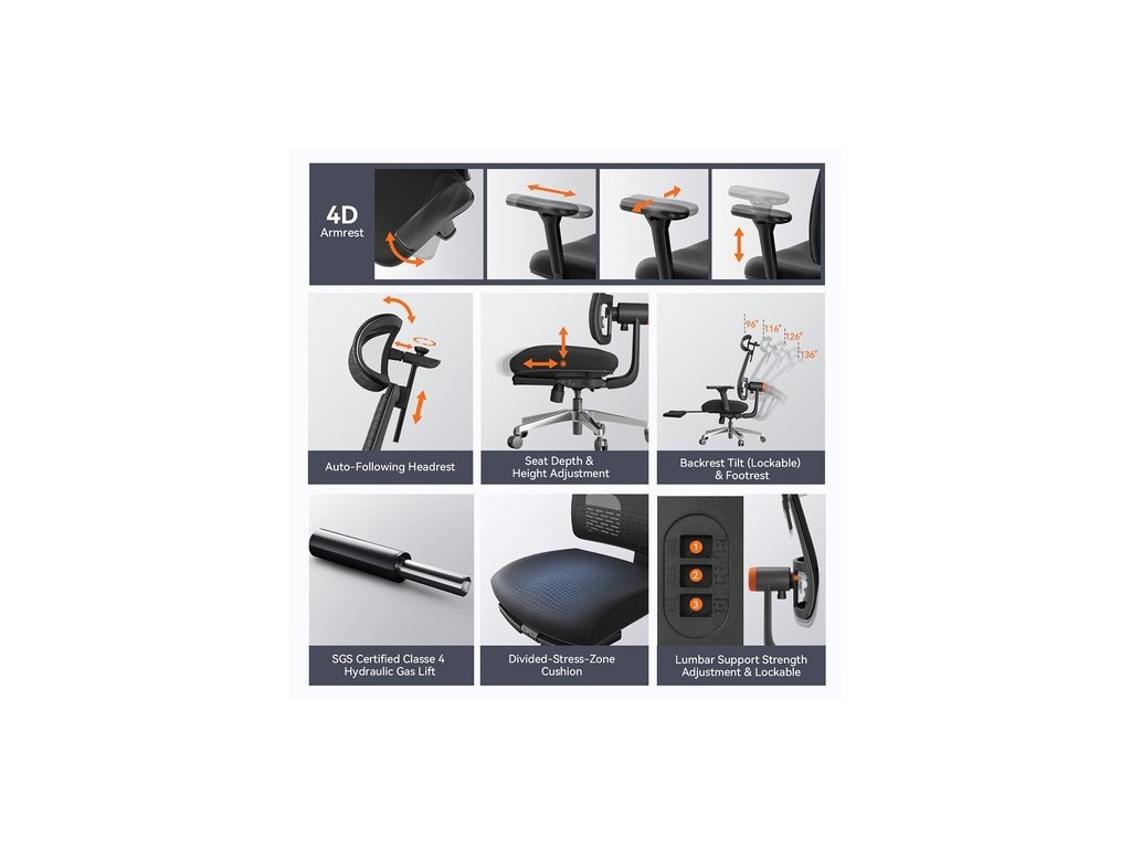 Az automatikus fejtámla automatikusan alkalmazkodik a fej és a nyak mozgásához, folyamatos és optimális alátámasztást biztosítva. Visszahajtható lábtartóval rendelkezik, és 4 kulcspozícióban, 96°-136°-os dőlésszögben rögzíthető, így folyamatosan kényelmes marad. Ez valóban a tökéletes rendszer a munkához és a szabadidőhöz.