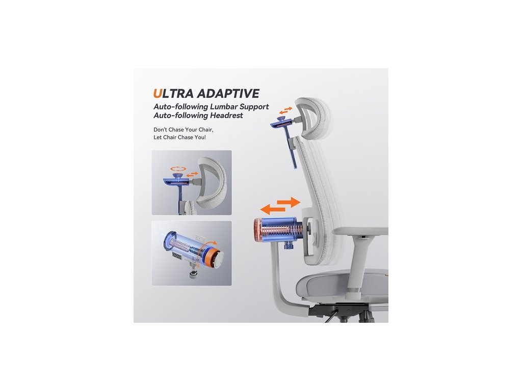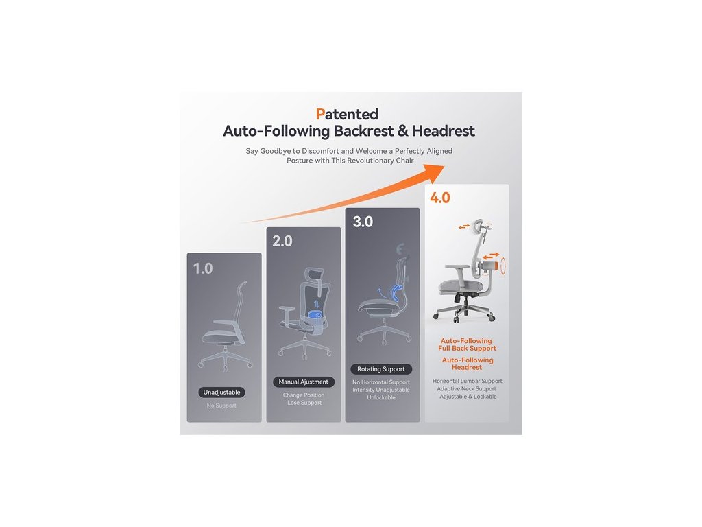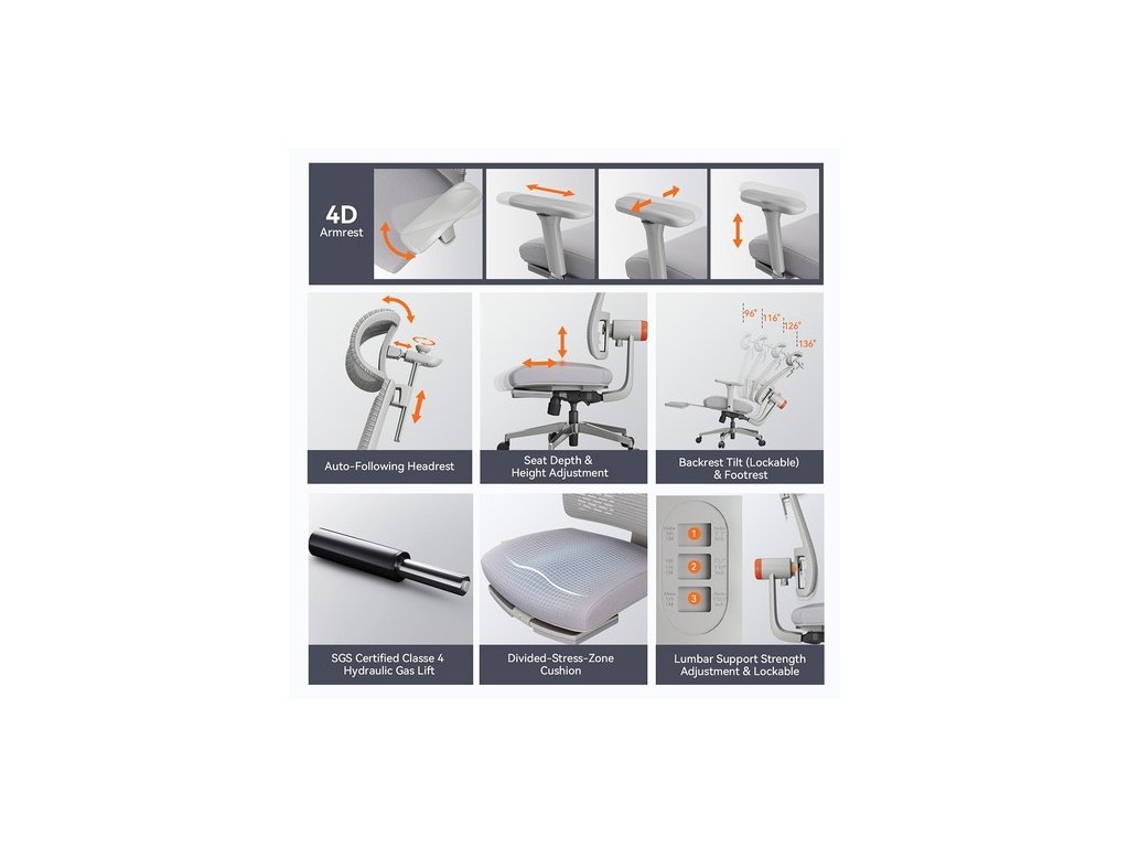 Az automatikus fejtámla automatikusan alkalmazkodik a fej és a nyak mozgásához, folyamatos és optimális alátámasztást biztosítva. Visszahajtható lábtartóval rendelkezik, és 4 kulcspozícióban, 96°-136°-os dőlésszögben rögzíthető, így folyamatosan kényelmes marad. Ez valóban a tökéletes rendszer a munkához és a szabadidőhöz.