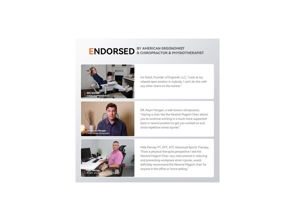 Ezt a széket olyan szakértők támogatták, mint Iris Sokol, amerikai ergonómus; Dr. Kevin Morgan, egy neves csontkovács; és Matt Penney PT, DPT, ATC az Advanced Sports Therapy-tól. Elősegíti a nyugodt, semleges hátpozíciót, hatékonyan enyhíti és megelőzi a helytelen testtartás okozta sérüléseket, ami megkülönbözteti a többi széktől.