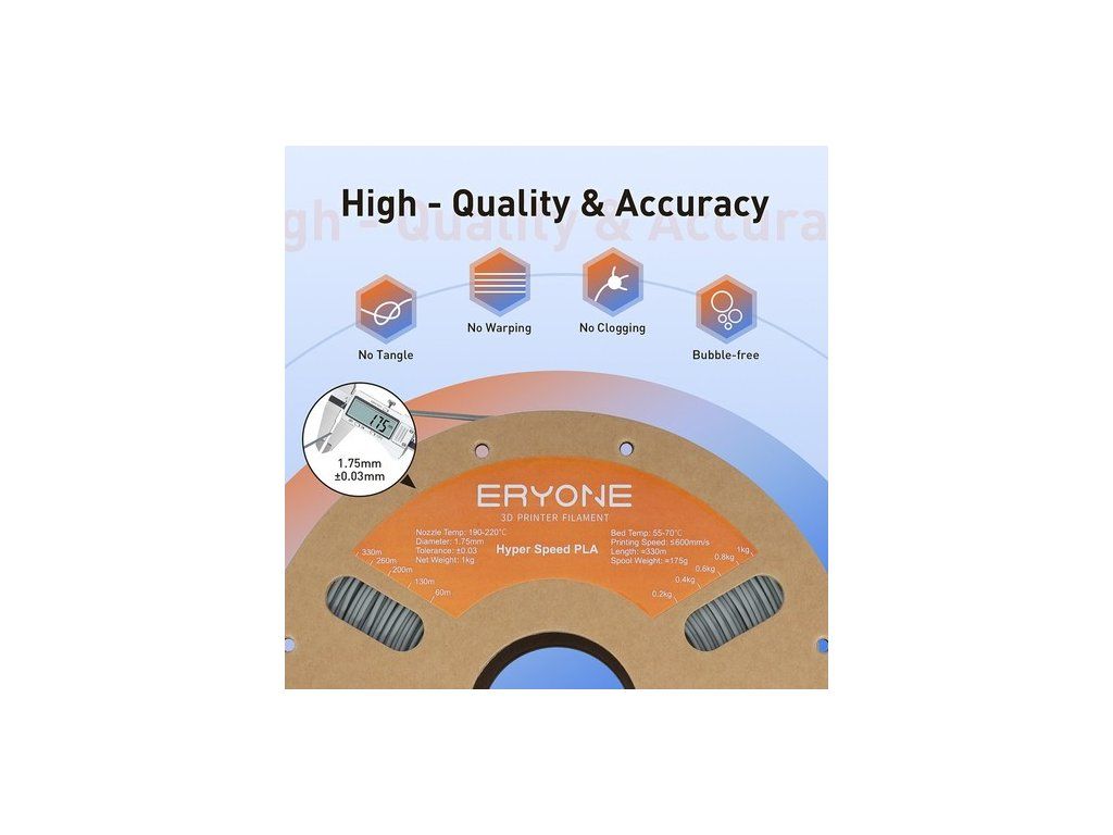 Nagy sebességű PLA filamentERYONE fokozott folyékonysággal rendelkezik, gyorsan olvad és simán folyik, és nagy nyomtatási sebességet ér el, akár 600 milliméter per másodperc. Így gyorsan befejezhet egy projektet a minőség romlása nélkül.