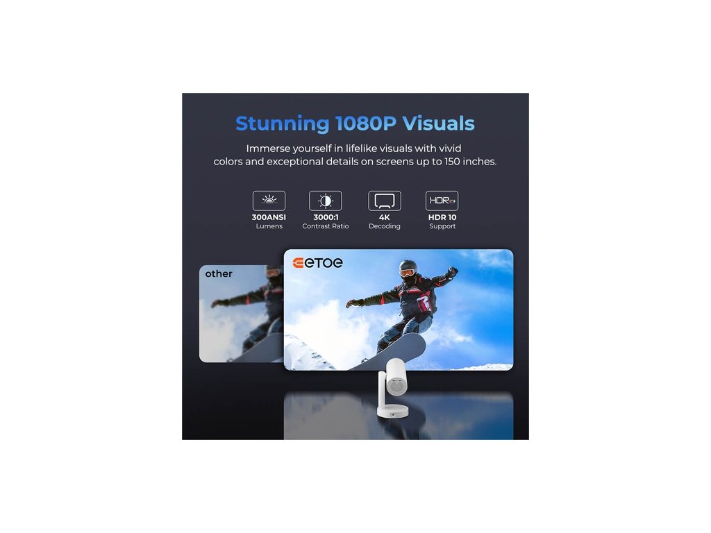 Az ETOE Starfish Plus projektor a legkorszerűbb Google TV rendszerrel van felszerelve, amelyet a Netflix és a Google is tanúsított. Tapasztalja meg a 4K videódekódolás izgalmát, amely lenyűgöző tisztasággal kelti életre kedvenc műsorait és filmjeit. A több mint 10 000 alkalmazáshoz, köztük olyan népszerű szolgáltatásokhoz, mint a Netflix, a Prime Video és a YouTube, való hozzáféréssel mindig van mit nézni. A beépített AirPlay és Chromecast funkciók lehetővé teszik, hogy könnyedén streamelje vagy tükrözze a tartalmat az eszközeiről a 150 hüvelykes, nagyméretű képernyőn, így bármilyen összejövetel vagy szabadtéri parti élénk és magával ragadó élményt nyújt.