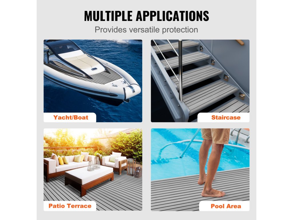 Négy színben kapható: terepszínű, szürke, sötétszürke és barna. A VEVOR hajódeszka habszivacsok 11,62 m² és 31,02 m² közötti méretekben alkalmasak lépcsőkhöz, hajókhoz vagy medenceteraszokhoz.