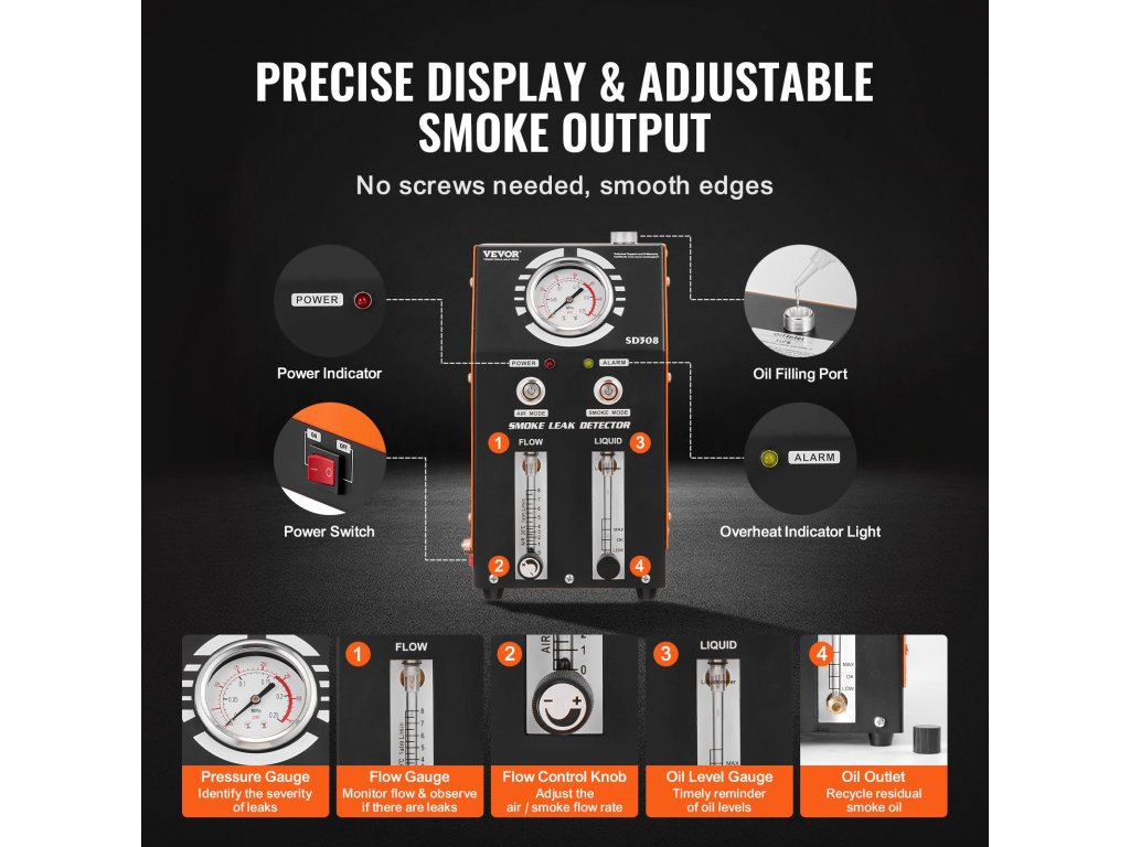 Érje el a szivárgás pontos felderítését a VEVOR diagnosztikai eszközzel, amely 3 nagy pontosságú műszerrel van felszerelve: digitális nyomásmérővel, olajszintmérővel és áramlásmérővel. Az áramlásszabályozó gombbal a füstkibocsátás is beállítható, így optimális eredményeket biztosít a különböző vizsgálati körülmények között.