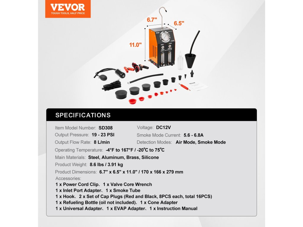 Diagnosztikai üzemanyagvezeték-tesztelőnk univerzális adapterrel, kúpos adapterrel, EVAP-adapterrel, szívócsőadapterrel, 16 kupakdugóval, tápkábel-kapoccsal, szelepmagkulccsal, füstcsővel, tankolópalackkal és kampóval rendelkezik. Ne feledje, hogy használat előtt adjon hozzá 10-20 ml babaolajat vagy ásványi olajat (nem tartozék)