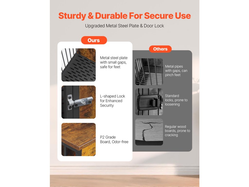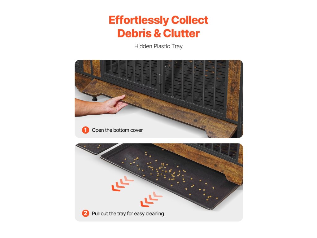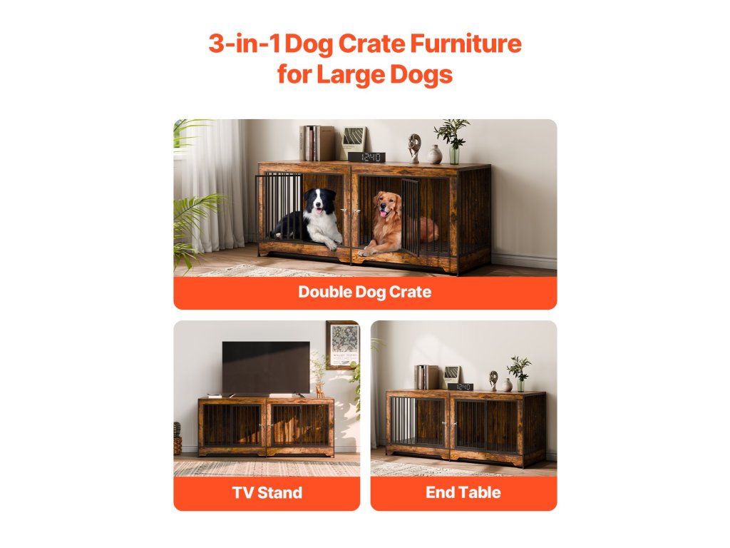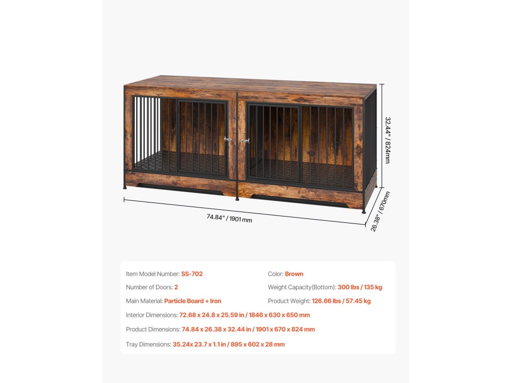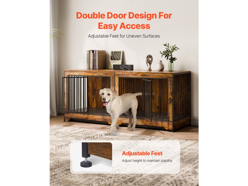 Ez a bútor stílusú kutyaláda ötvözi az esztétikát és a funkcionalitást megerősített acélkerettel, állítható rekesszel, két ajtóval, biztonságos zárakkal és többfunkciós felsővel. Könnyen összeszerelhető, és tökéletesen alkalmas arra, hogy eleganciát kölcsönözzön otthonának, miközben a háziállatok kényelmét szolgálja.
