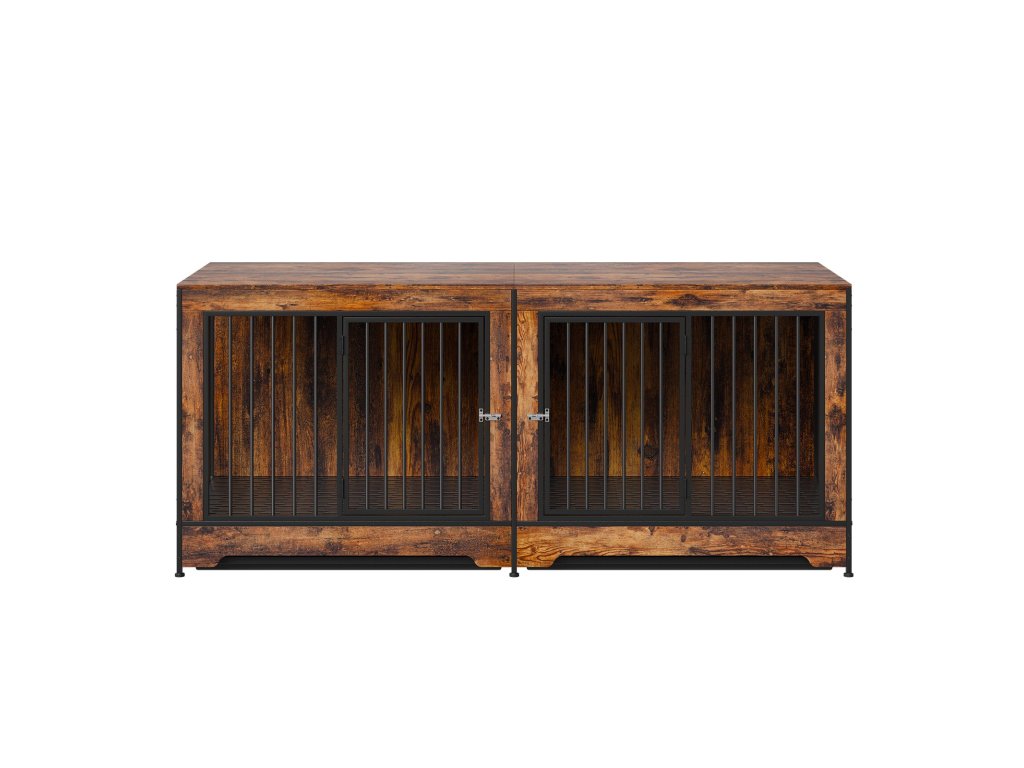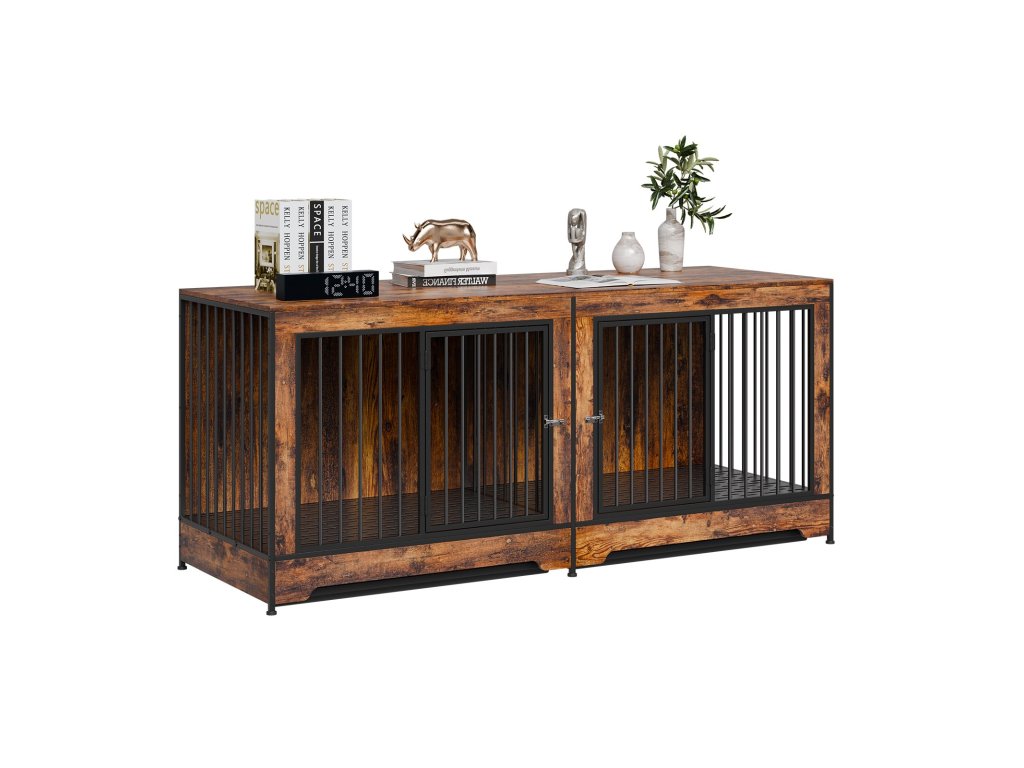 Fa dupla kutyaketrec 2 kutyának, válaszfallal, dupla ajtóval, TV-állvánnyal