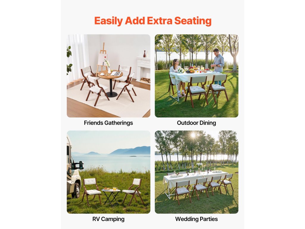 Fából készült összecsukható székeink akár 400 font/180 kg-ot is elbírnak, és nagy ülőpárnákkal rendelkeznek a további kényelem érdekében. Az egyszerűen összecsukható kialakításnak köszönhetően kényelmesen tárolhatók és hordozhatók.