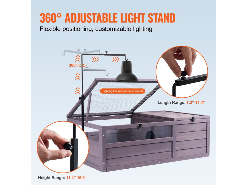 360°-ban elforgatható, állítható magasságú és hosszúságú függőlámpatartóval felszerelt, amely lehetővé teszi a hőmérséklet pontos szabályozását és az UVA + UVB sugárzás befogadását a teknősök lakhelyén. Ez biztosítja, hogy teknőse vagy más hüllője megkapja az egészséges növekedéshez szükséges fényt, akár beltérben is.