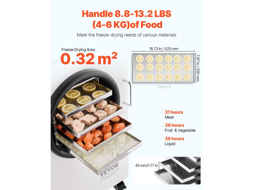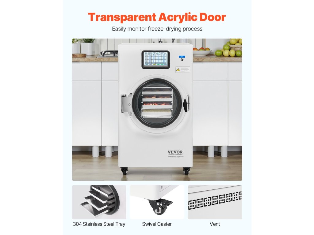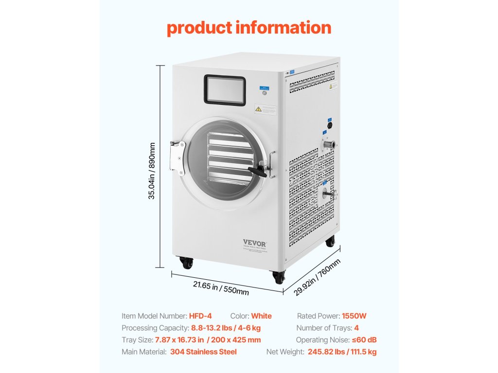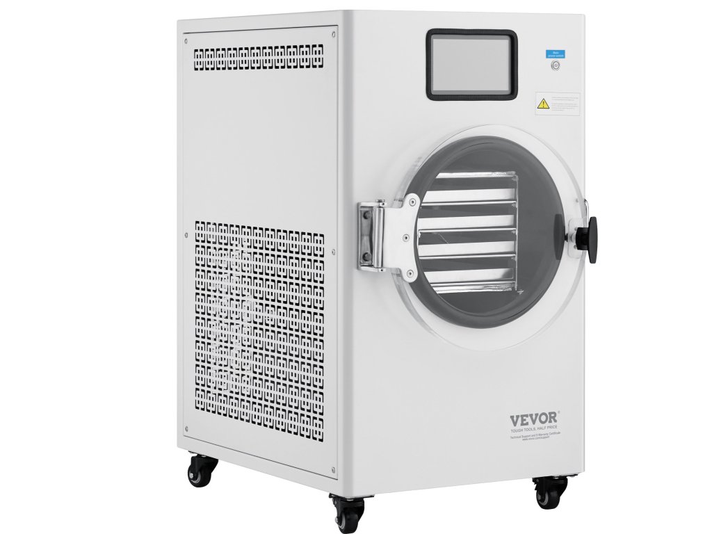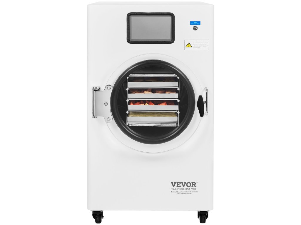 Fagyasztva szárító 8,8–13,2 font/adag, 4 tálca, vákuummal, állítható idővel/hőmérséklettel.