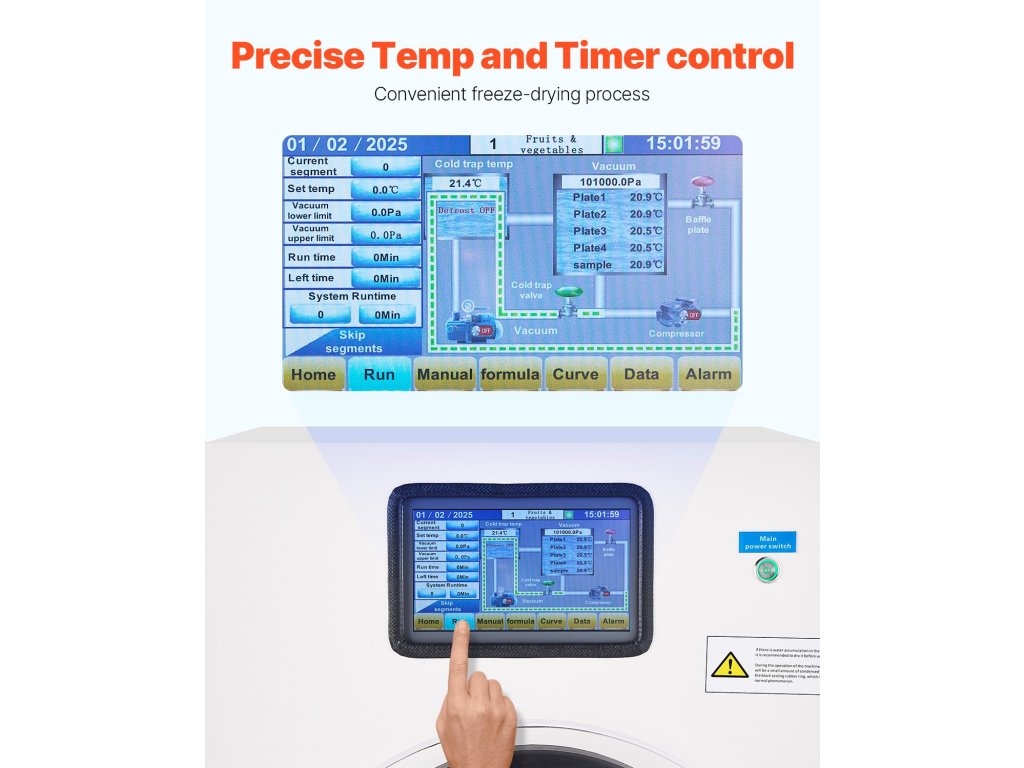 A nagy felbontású érintőképernyős kijelző kényelmes kezelést biztosít, erőteljes funkciókkal és szegmentált szárítási görbékkel, hogy megfeleljen a különböző anyagok fagyasztva szárítási igényeinek. Ügyeljen arra, hogy megfelelően földelt elektromos csatlakozót használjon ≤30°C-os üzemi környezeti hőmérsékleten.