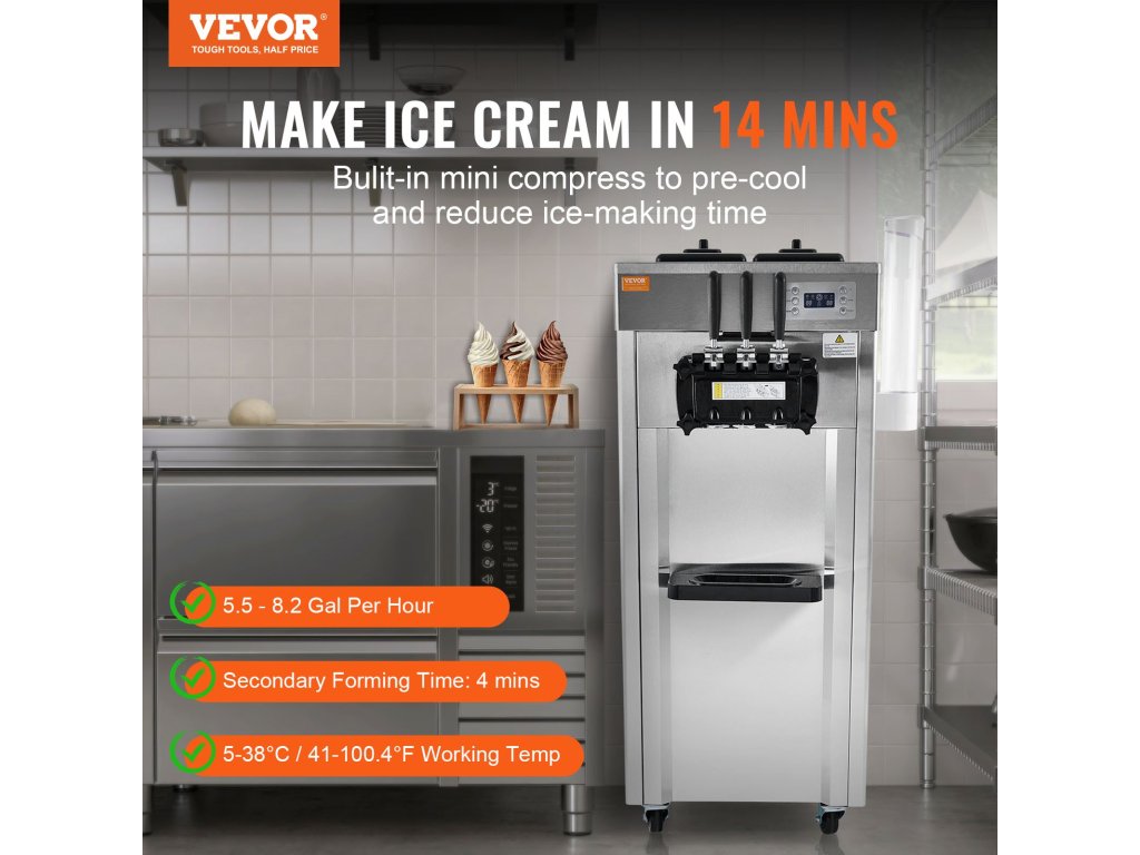 Ez a kereskedelmi fagylaltkészítő nagy teljesítményű kompresszorral és 2 független mini kompresszorral rendelkezik, amelyek mindössze 14 perc alatt képesek fagylaltot készíteni. Folyamatosan képes 6-8 fagylaltgolyó folyamatos adagolására, elérve az óránkénti 21 l/5,5 gal-31 l/8,2 gal fagylaltmennyiséget a tökéletes sima, krémes állagú keverék érdekében.