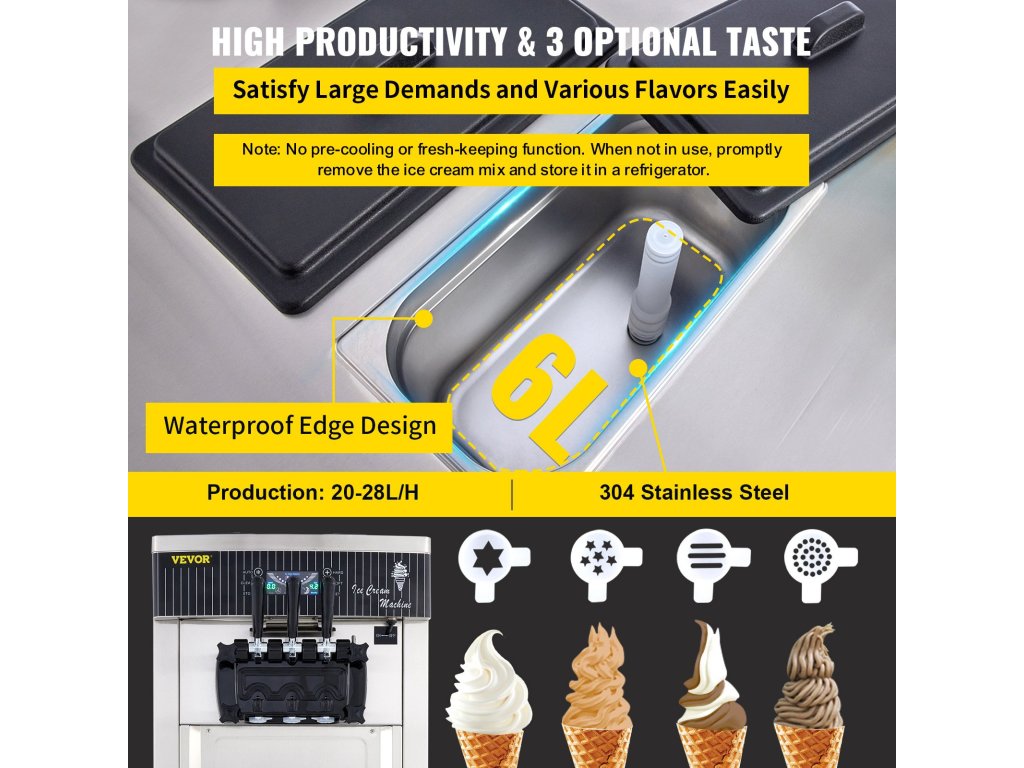 A tetején lévő két 1,6 gallonos (6 l) 304 rozsdamentes acélból készült tartályokkal felszerelve a termelés elérheti az 5,3-7,4 gallos (20-28 l) óránkénti mennyiséget. Más szóval, egyszerre körülbelül 10 fagylaltot tud hatékonyan előállítani. Nagyobb hozam, nagyobb nyereség!