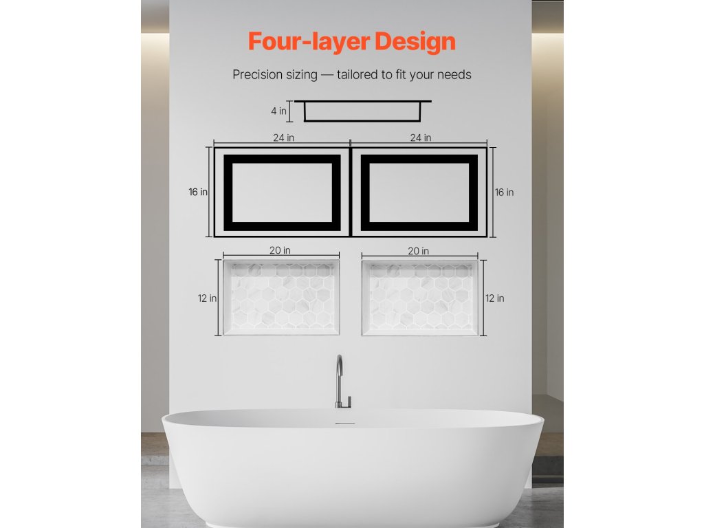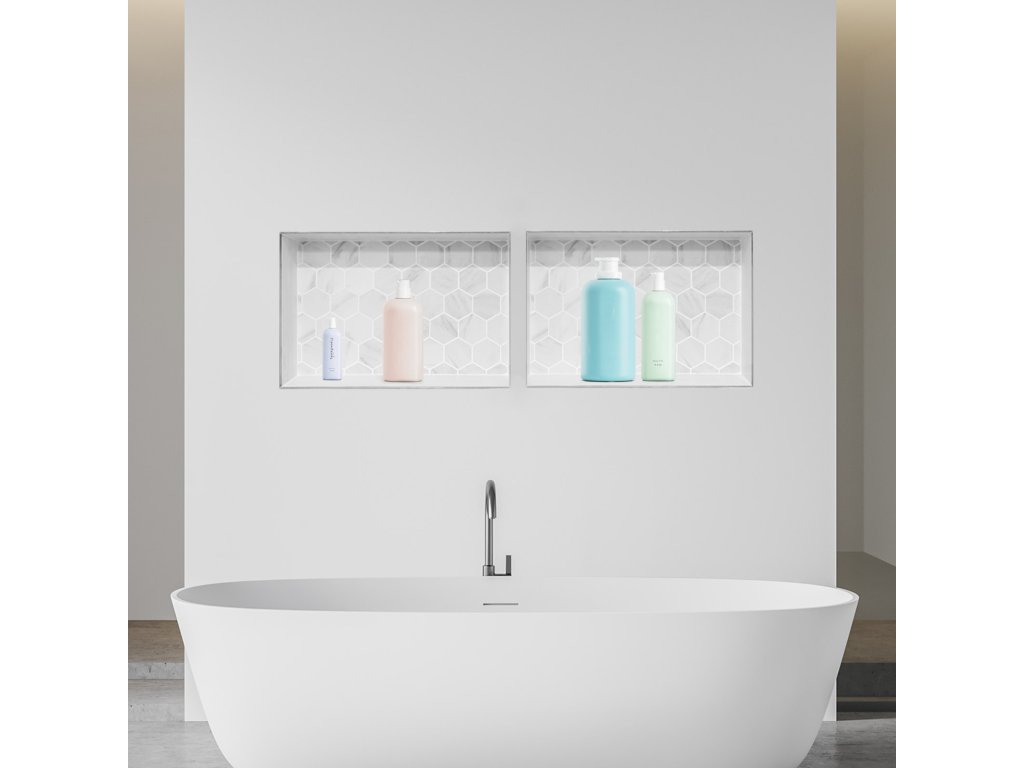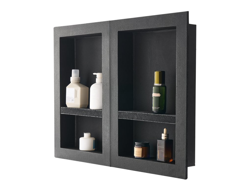Zuhanyfülke, tömített és vízzáró, megerősített felülettel a jobb teherbírás érdekében. A texturált rácsfelület kompatibilis bármilyen csemperagasztóval a könnyű szerelés érdekében. Tartalmazza a vízszintes vagy függőleges süllyesztett beépítéshez szükséges szerelőkészletet. Ideális fürdőszobákhoz, szekrényekhez, könyvespolcokhoz, konyhákhoz.