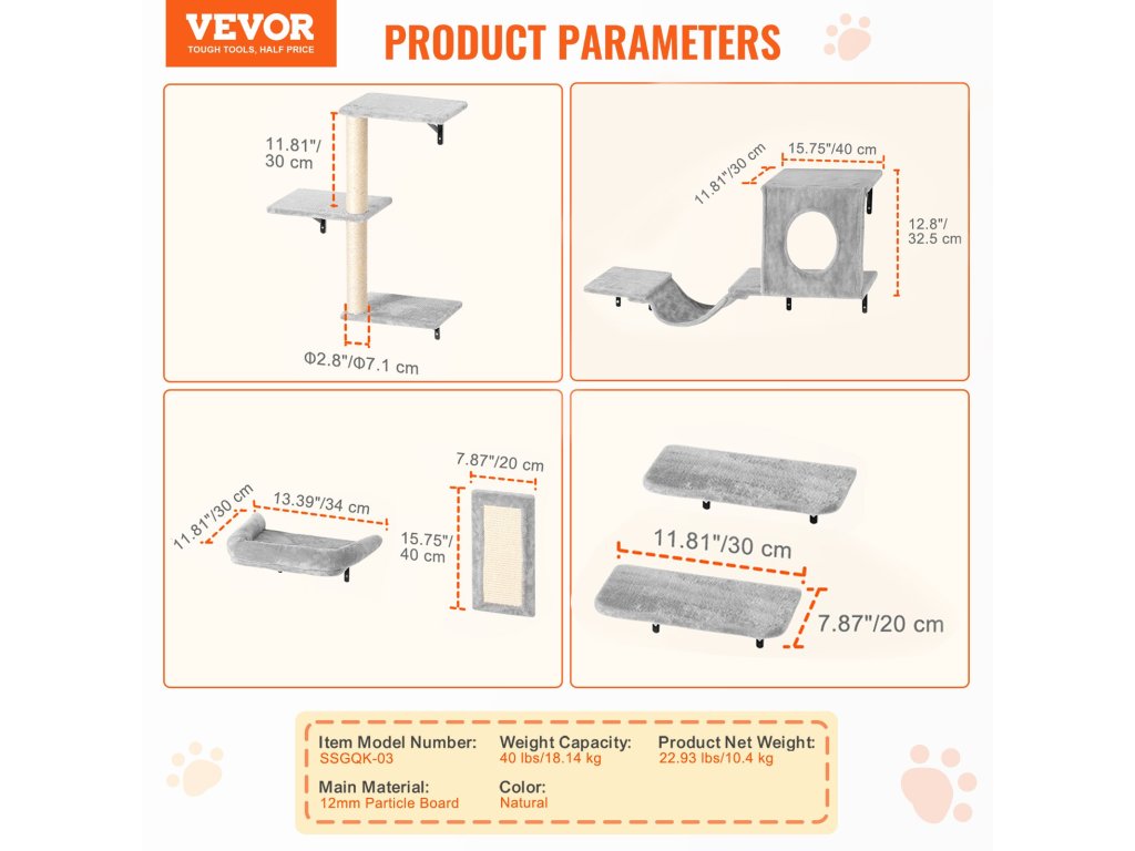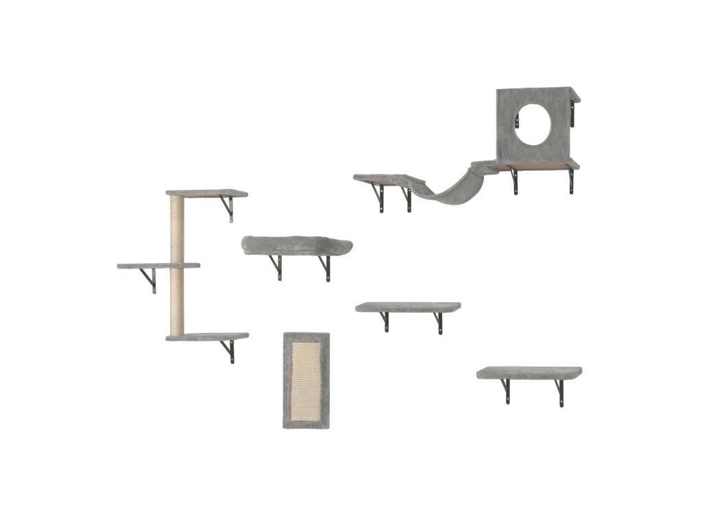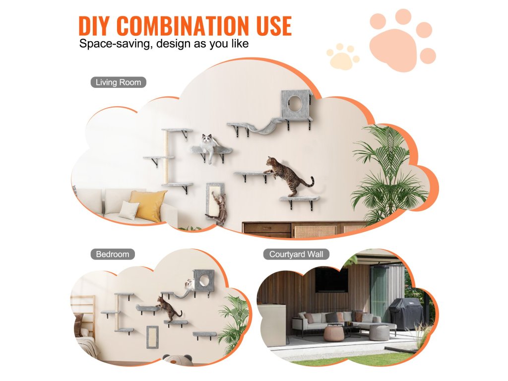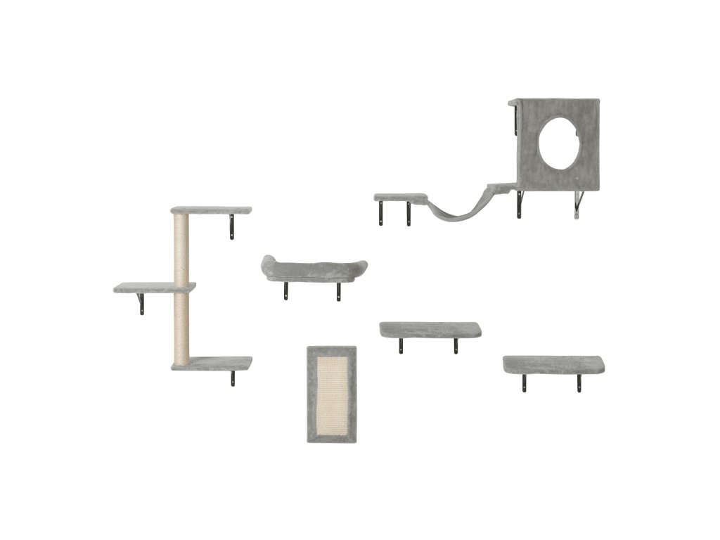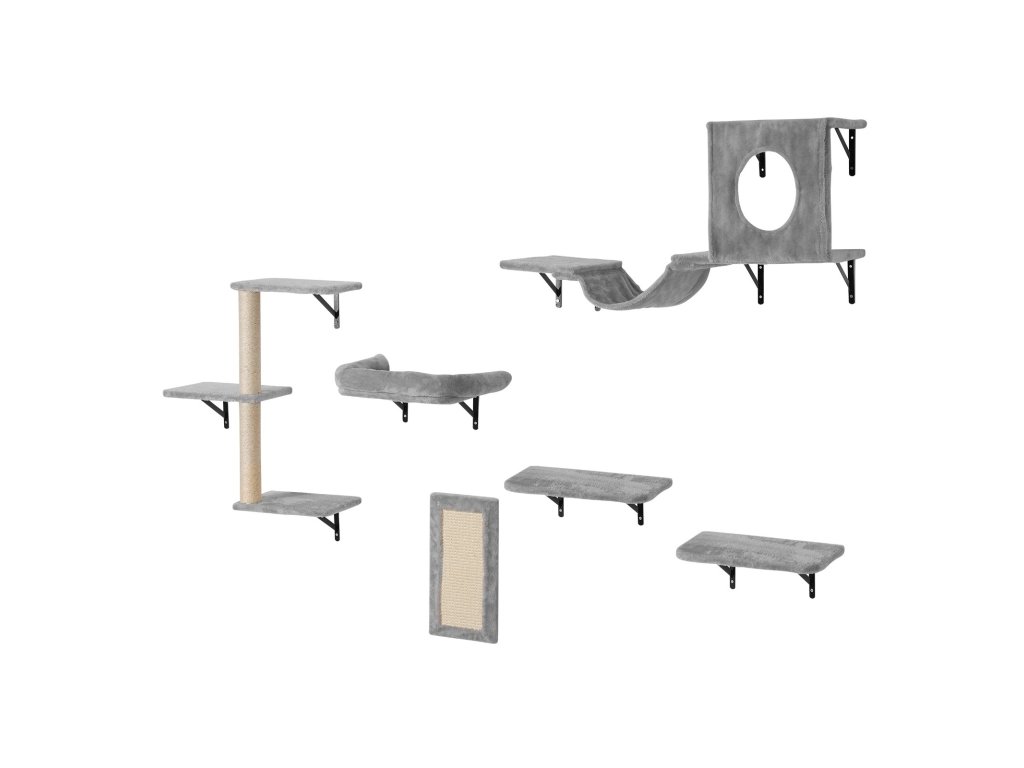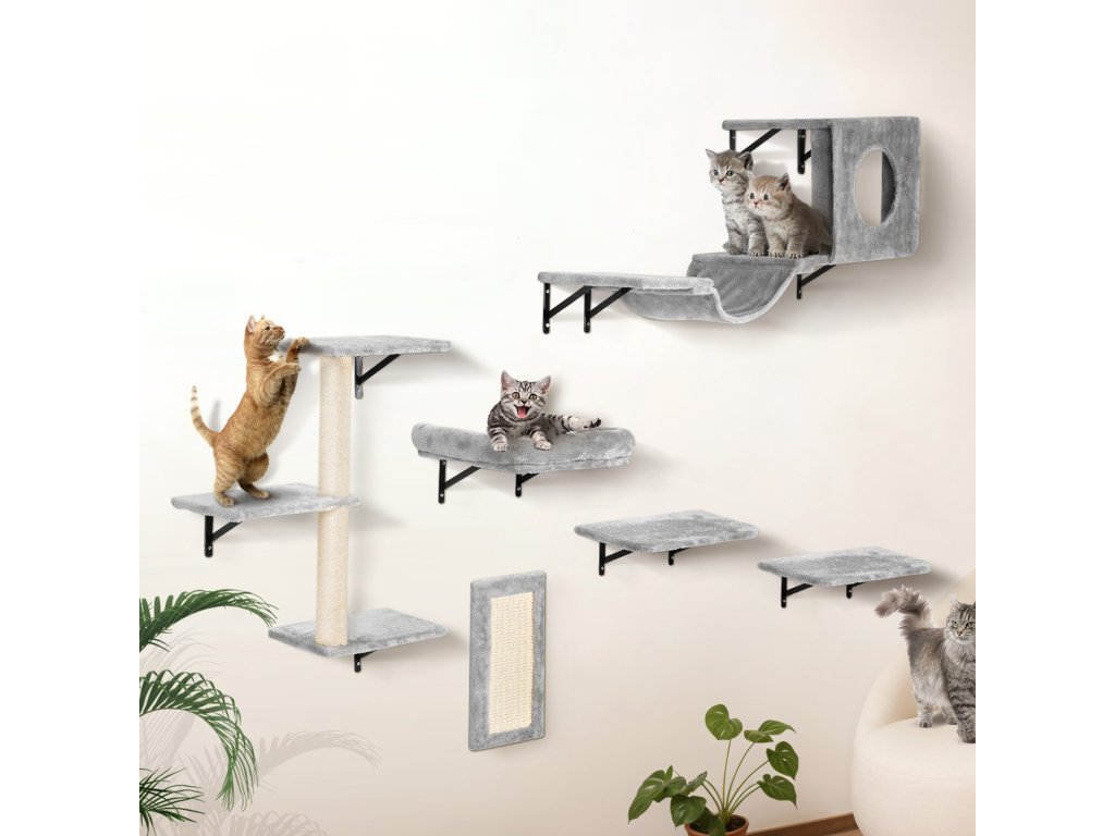 A macska fali polcunk 2 ugródeszkát, 1 függőágyat, 1 kanapét, 1 macskafát és 1 macskakapaszkodót tartalmaz, amelyek megfelelnek a különböző mászási, szórakozási, pihenési és kaparási igényeknek, és gazdagítják macskája játékát.