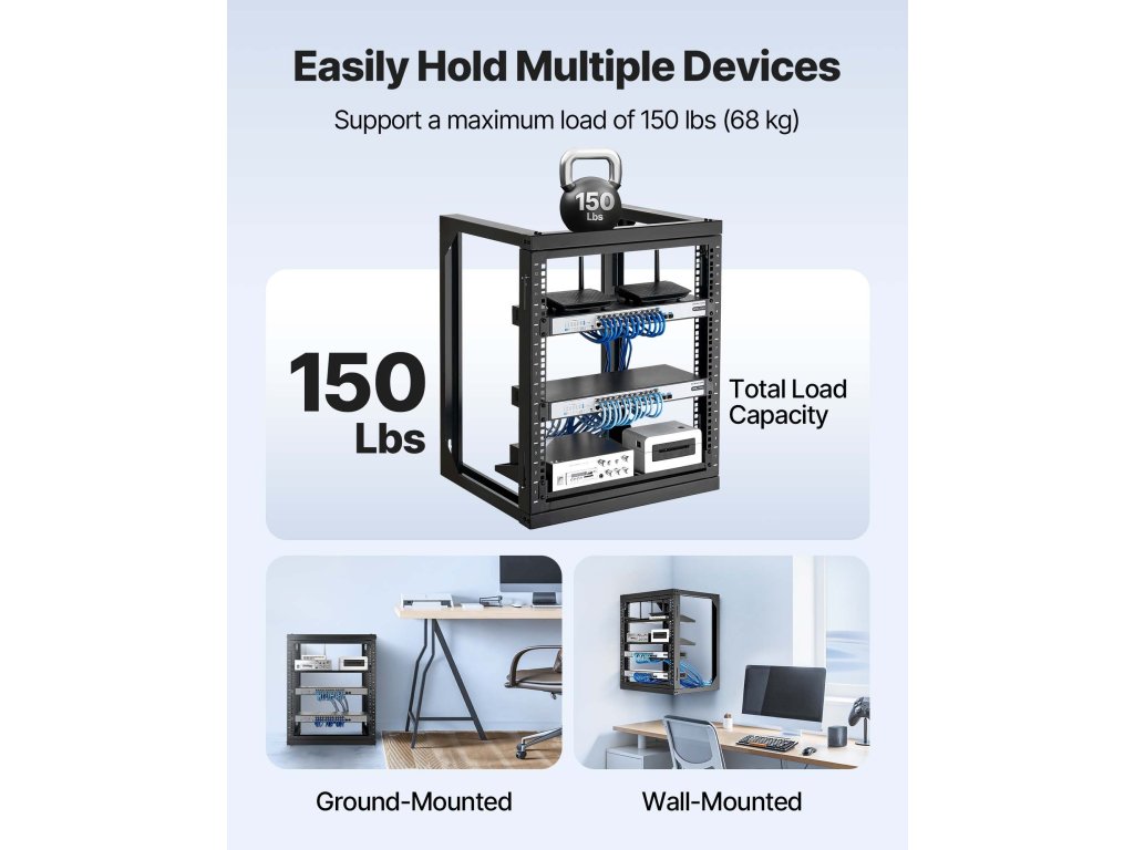 A hálótartó állványunk nyitott, 180°-os nyitást lehetővé tevő csuklós ajtóval van felszerelve. A masszív szénacél konstrukcióval rendelkező hálótartó akár 68 kg-ot is elbír, és stabilan tartja felszerelését. A teljes tartozékokkal biztonságosan felszerelheti a kapcsolókat vagy más hálózati berendezéseket közvetlenül az állványra!